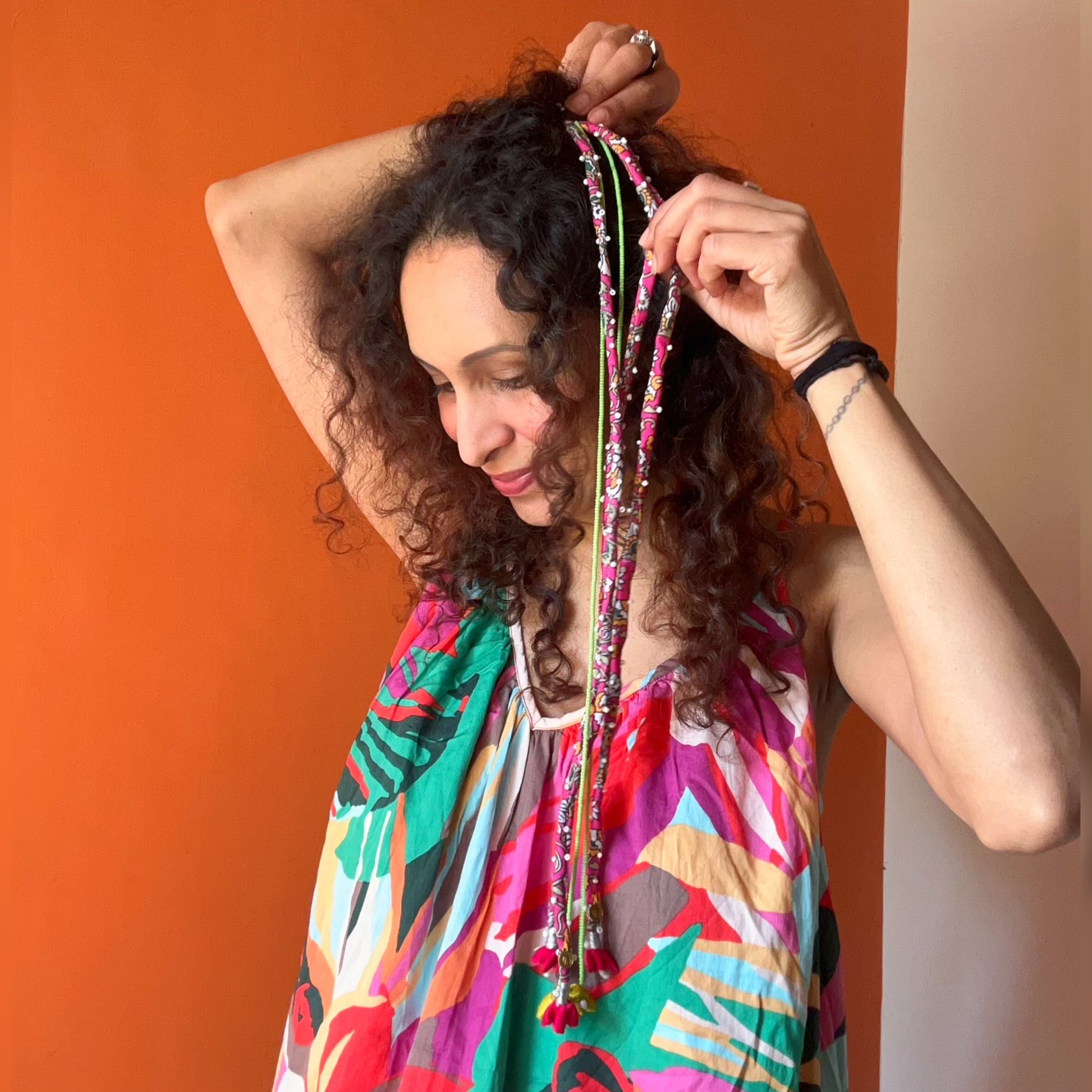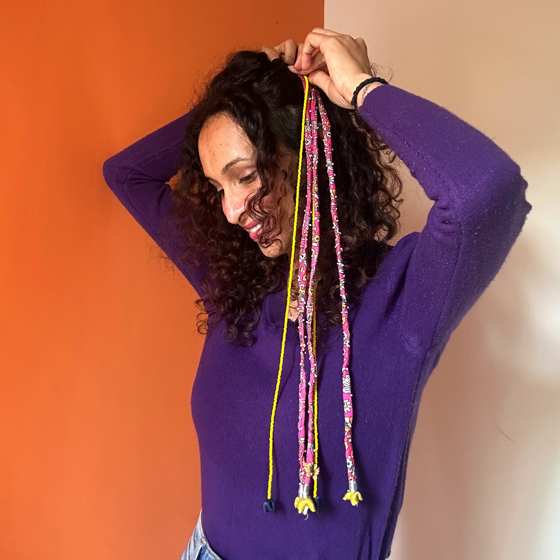 Beaded Looms Clip ins - pink printed with green beads 21 inch