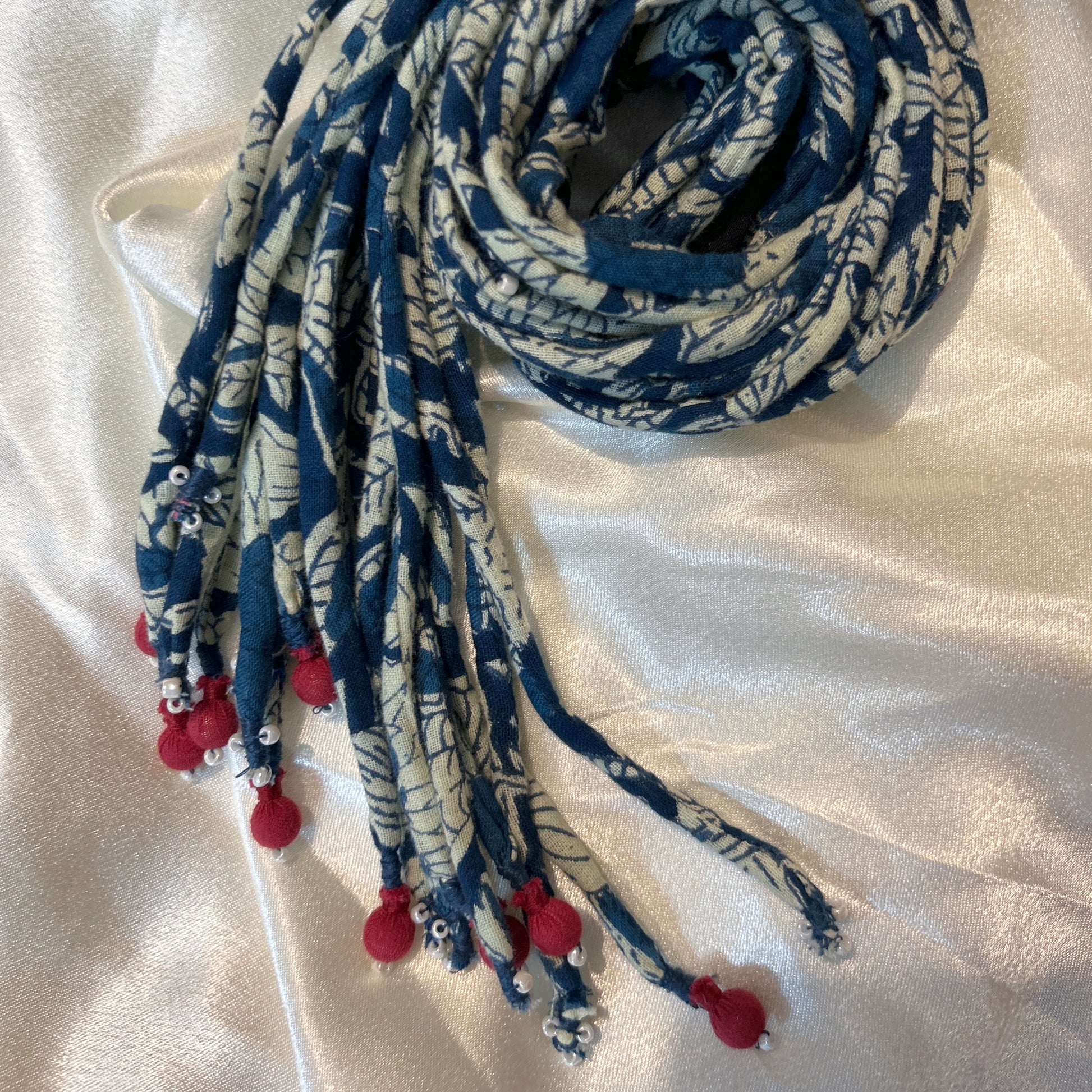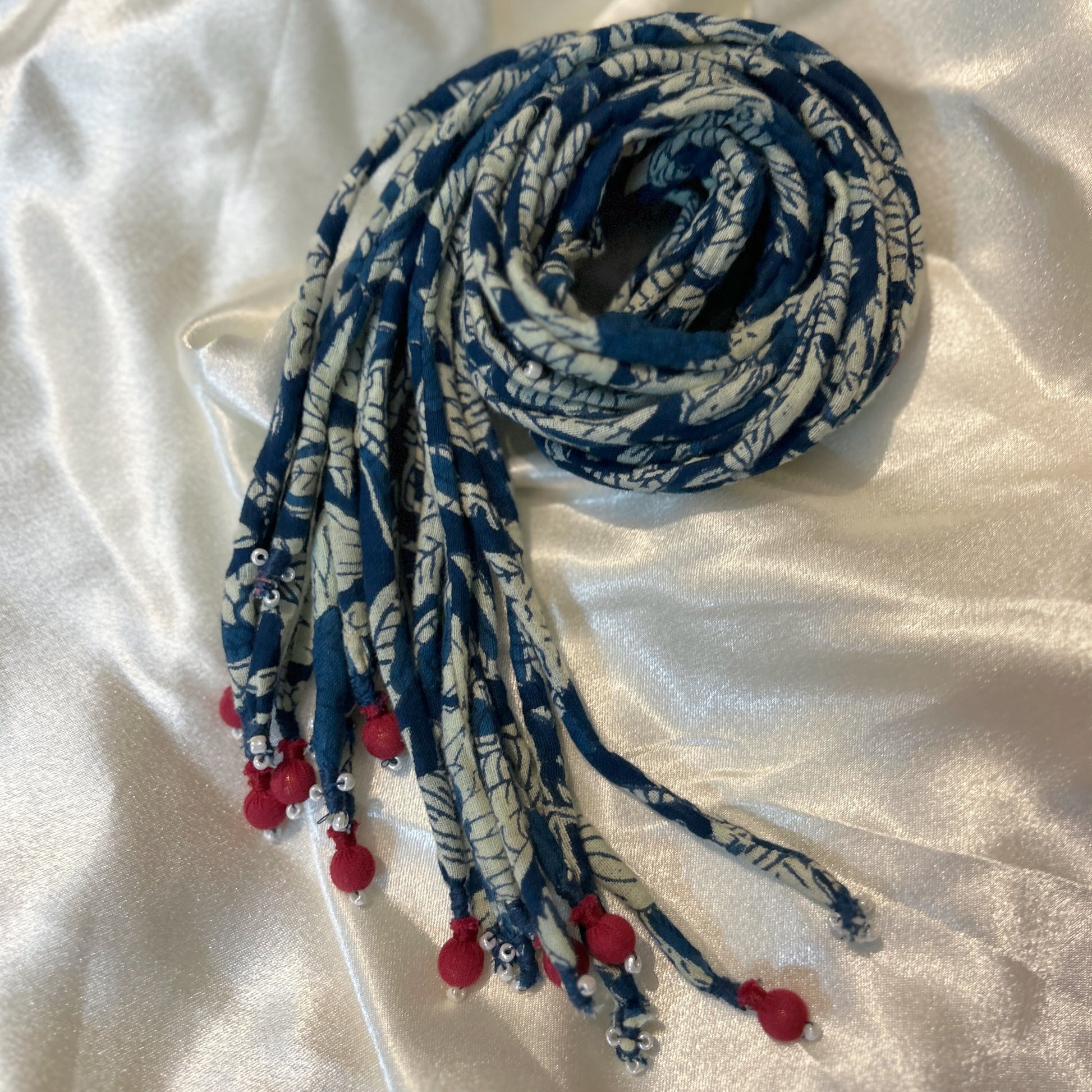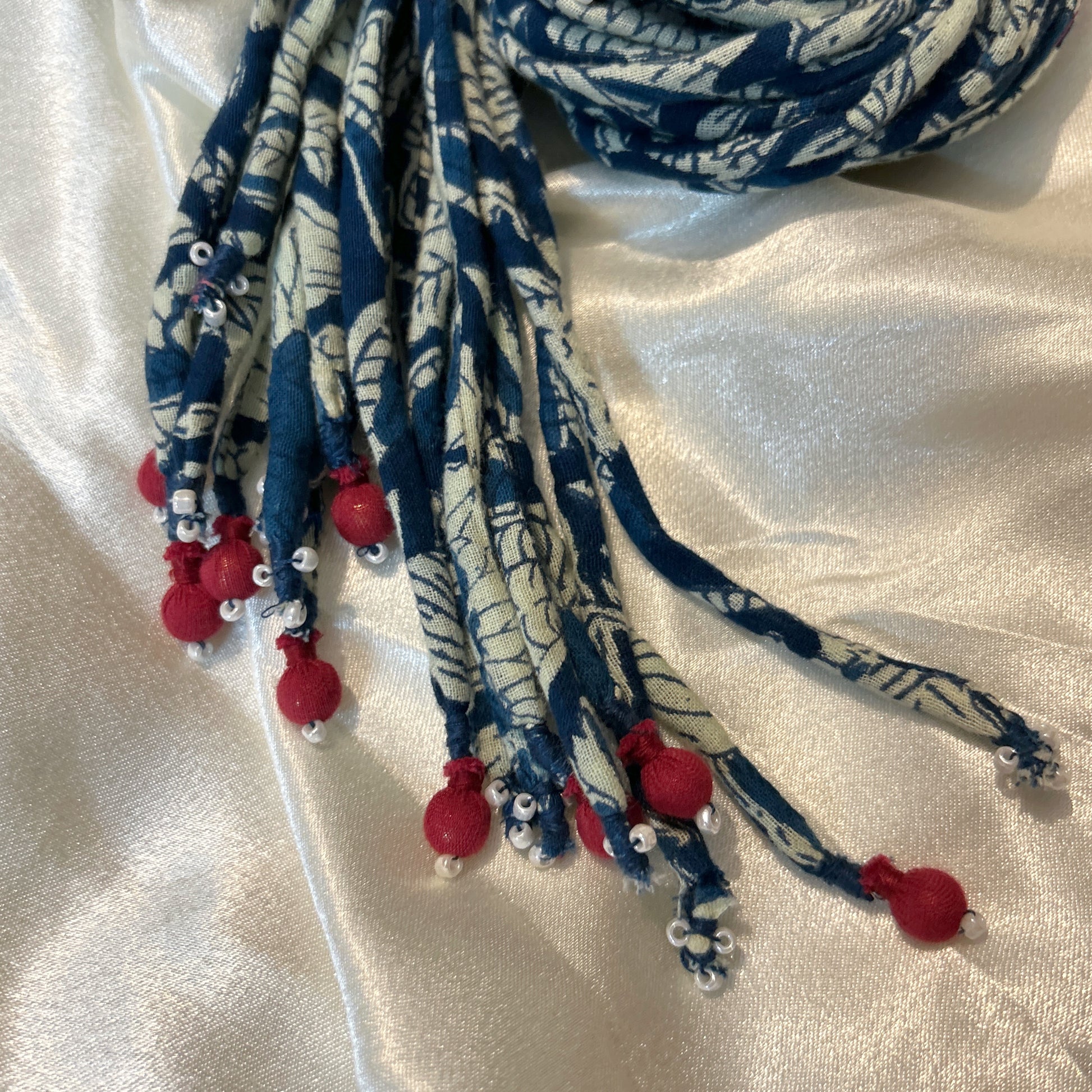 21 inch long hair strings with intricate glass bead work & textile beads at the end of each strand. This bunch comes with 9 strands divided into half.