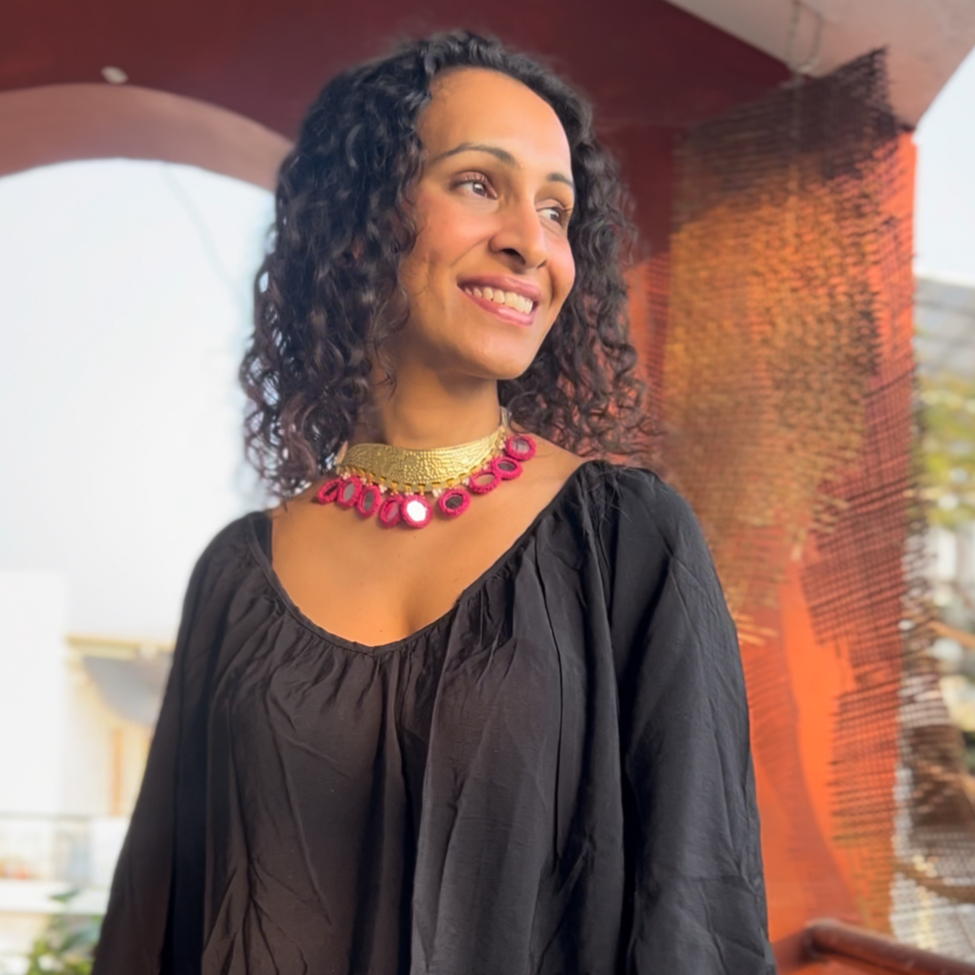 A brass choker with hand hammered work teamed up with hand embroidered mirrors & beads.