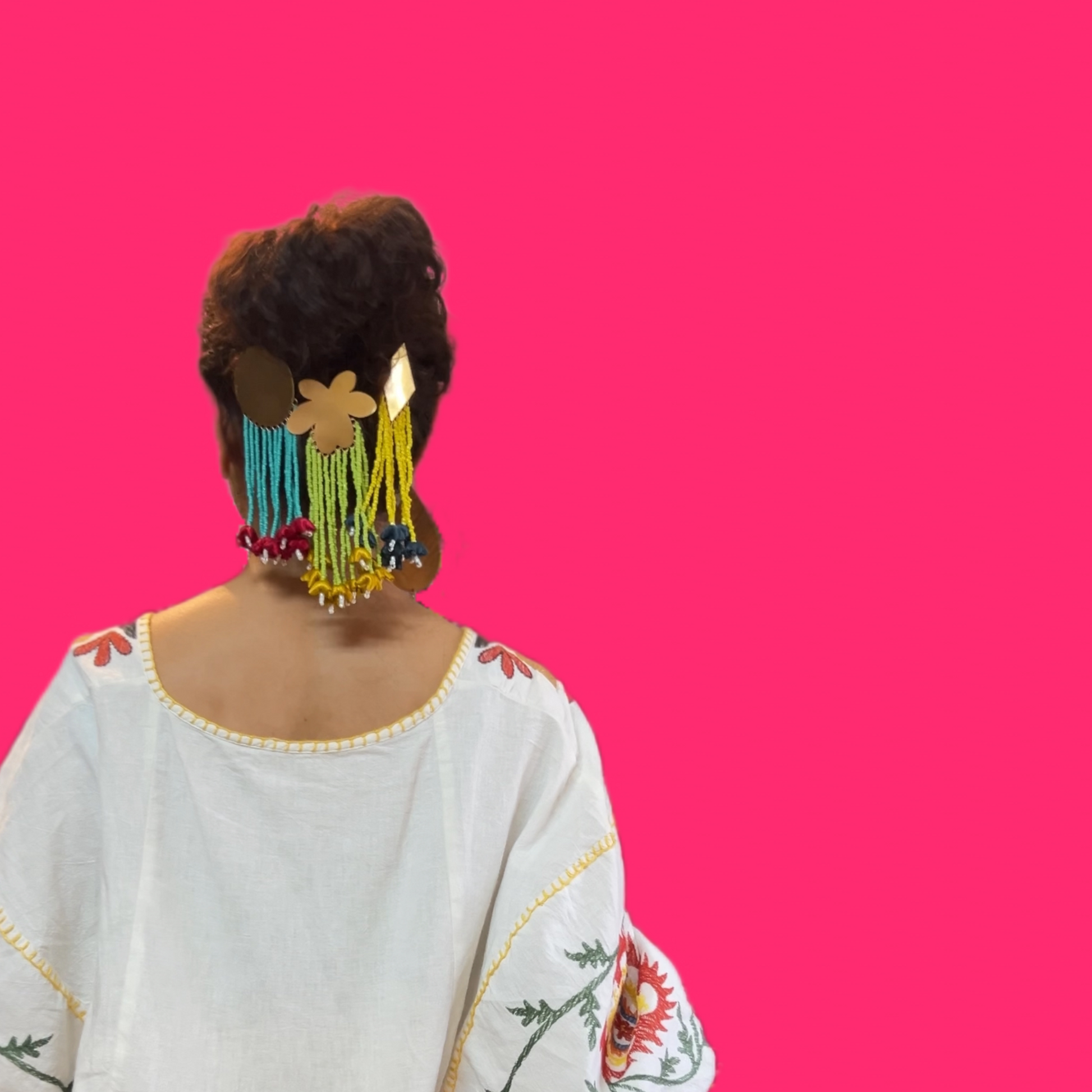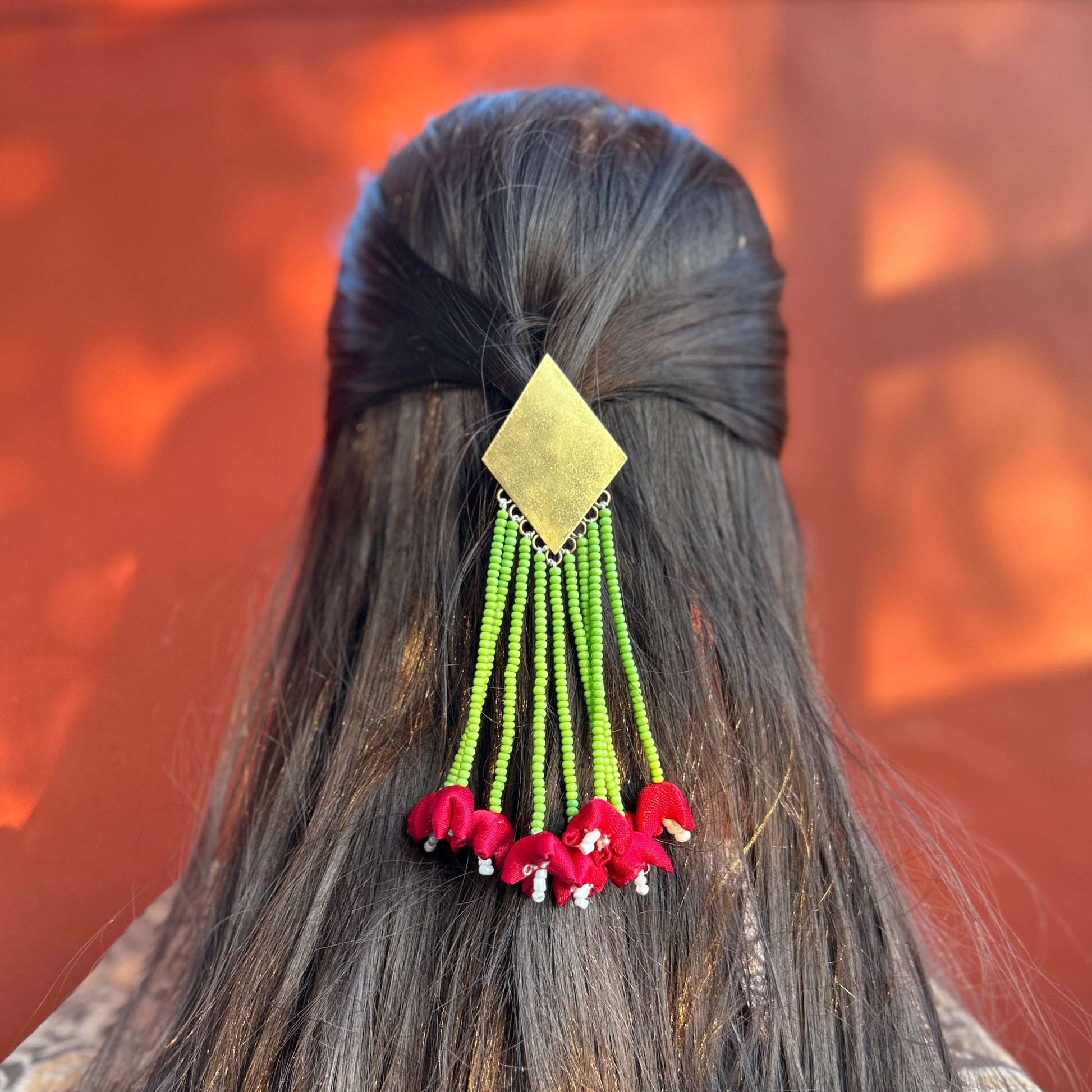 Cotton fabric & beaded clip in hair accessories. With textile flowers and brass charm hangings.