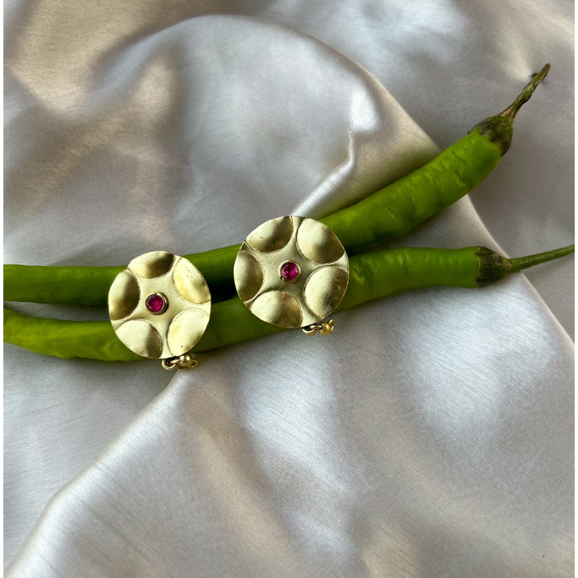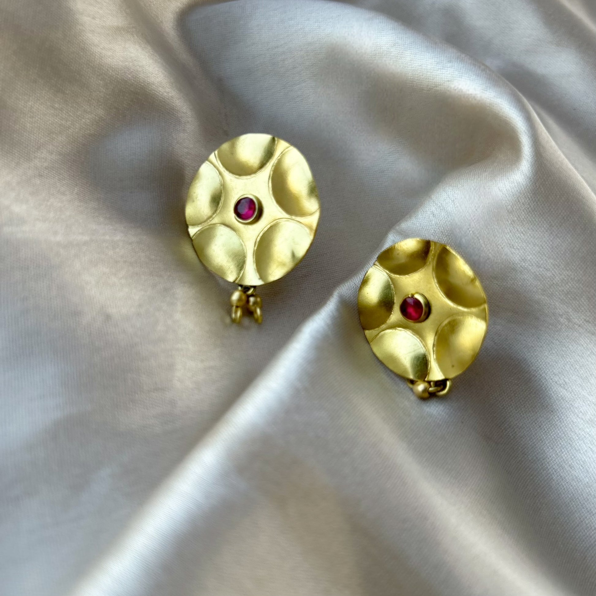 Circle hand hammered stud earrings with delicate CZ pink stone.