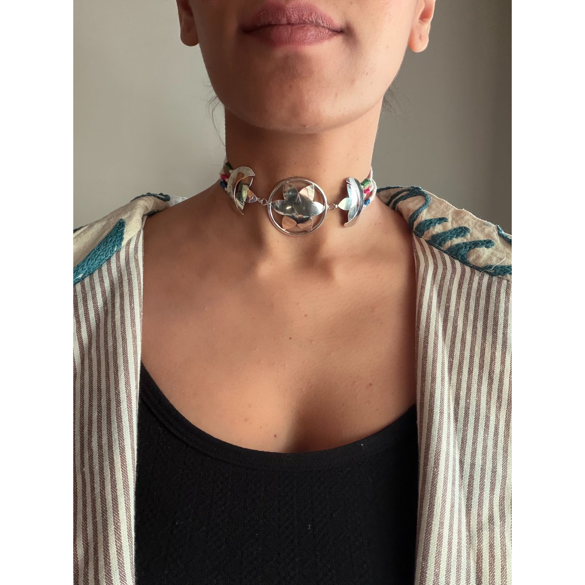 A beautiful brass choker with handcrafted moon & flower motifs. The choker comes with adjustable textile dori.