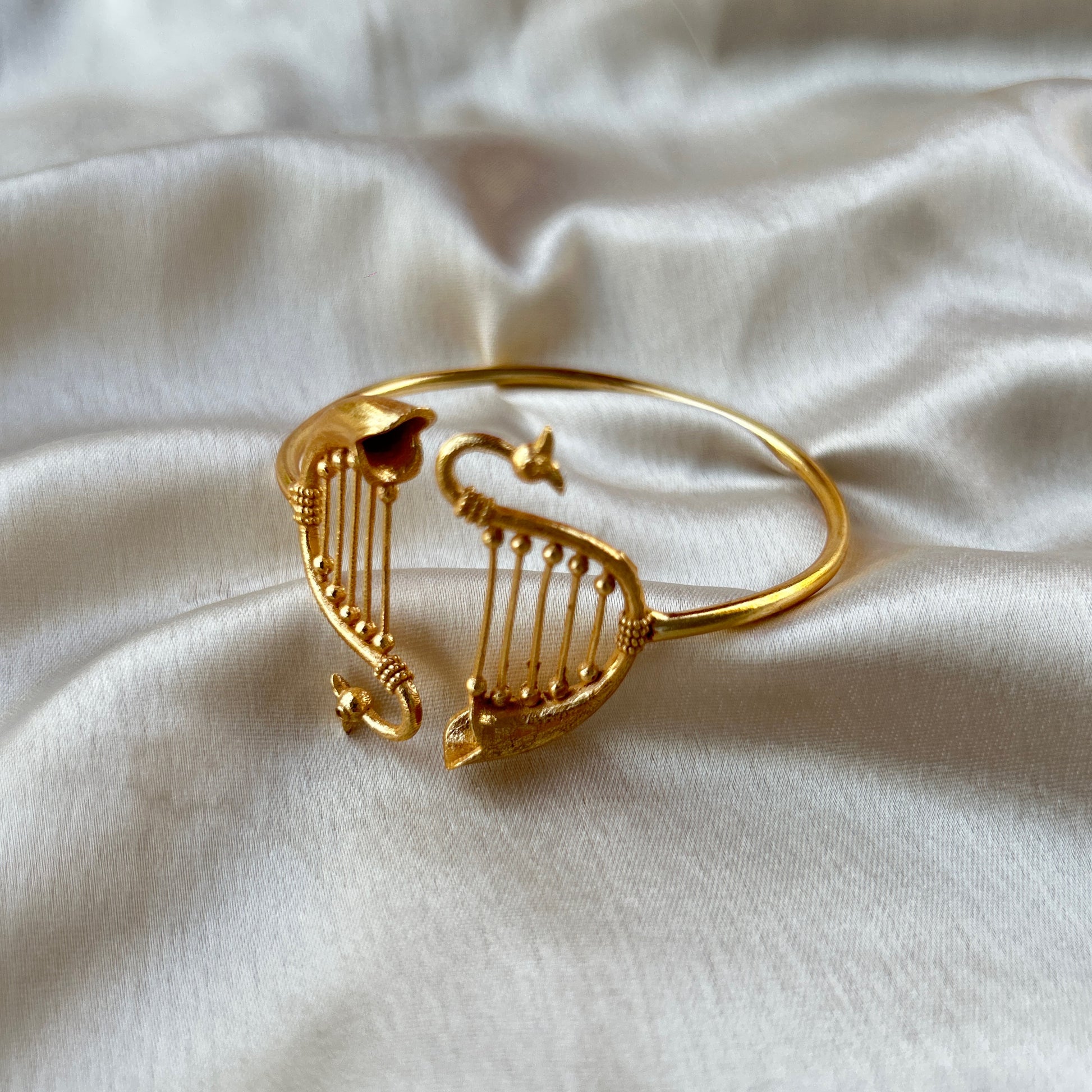The shape of harp music instrument and little bird face on it. A shiny, delicate bracelet, an adjustable, super light weight accessory.