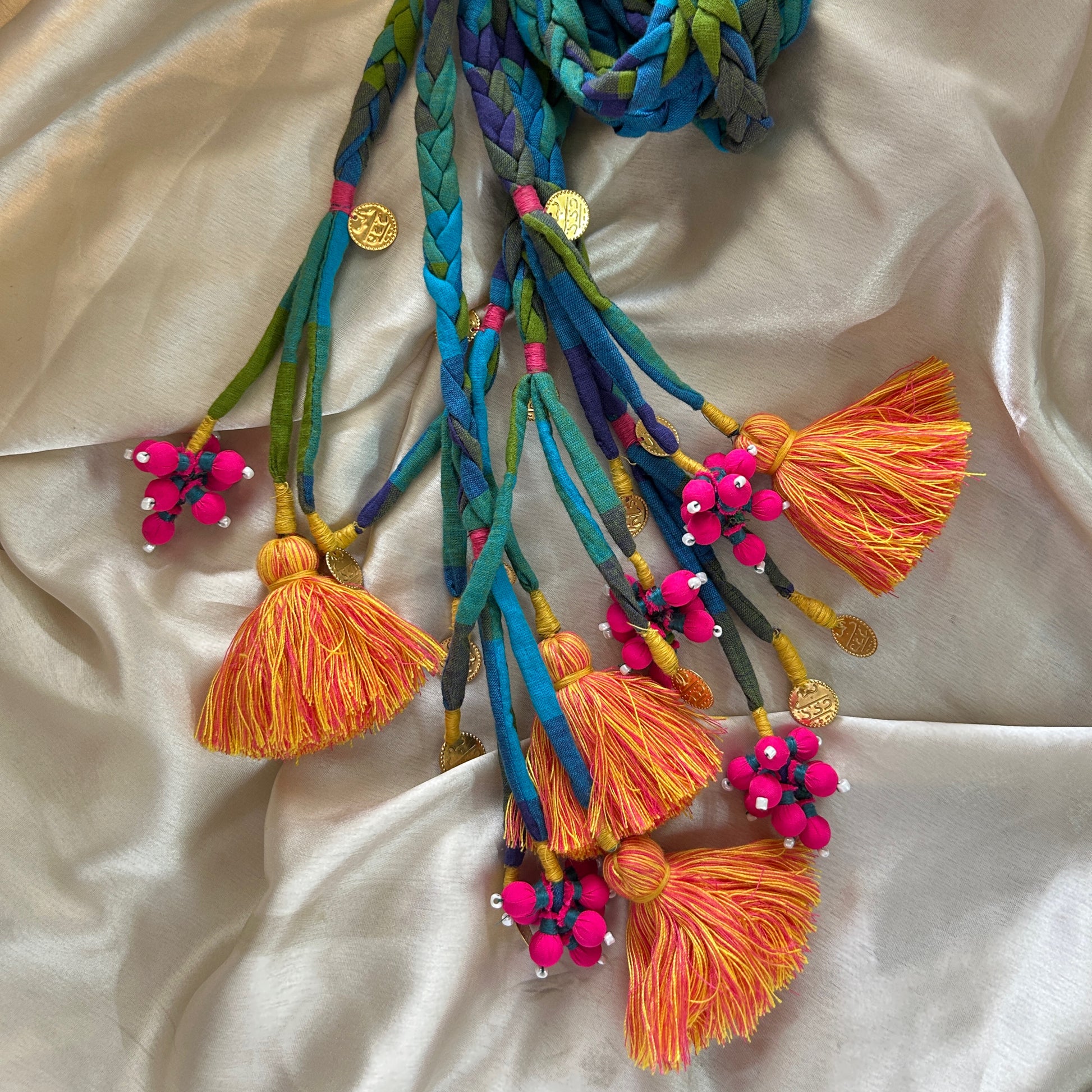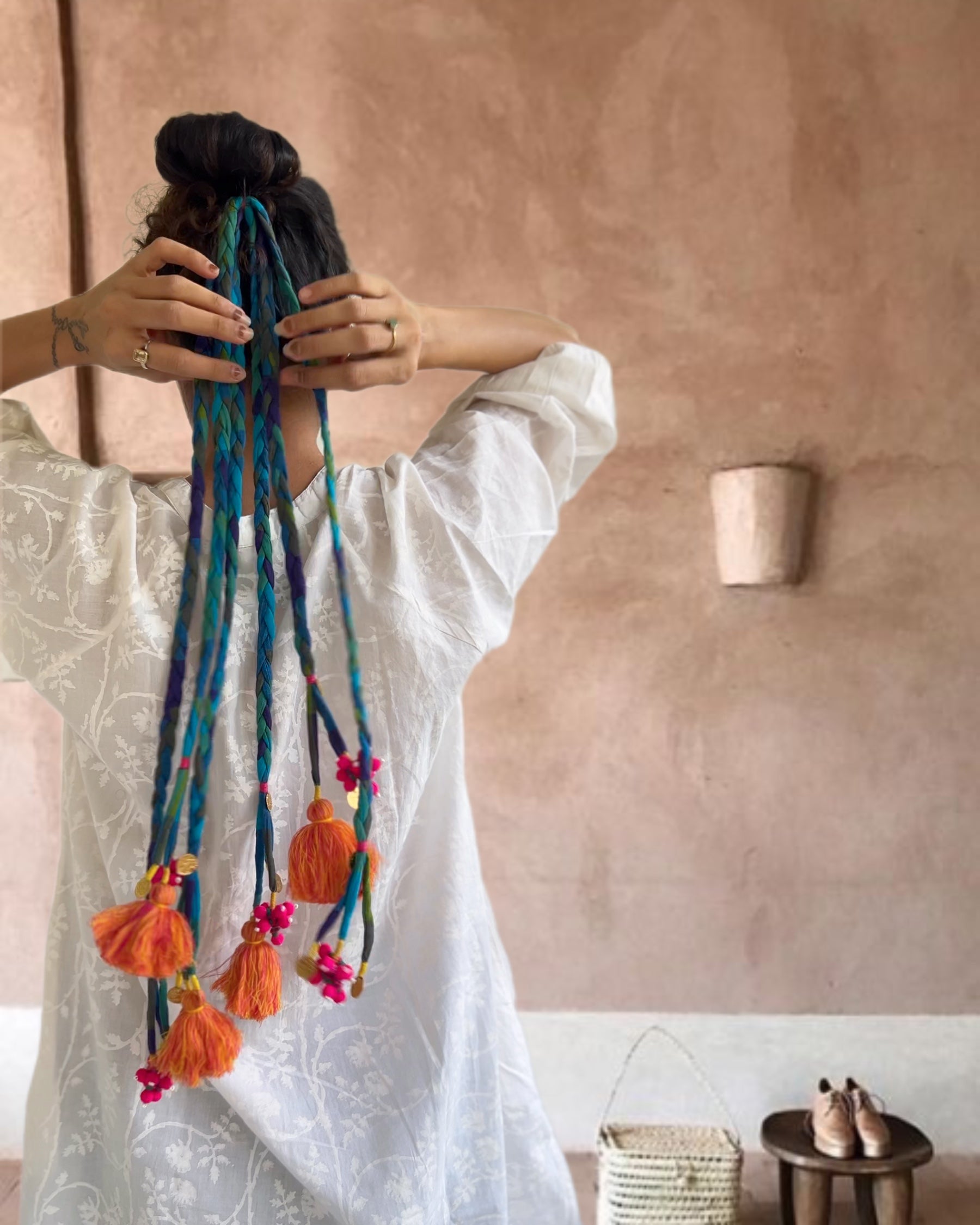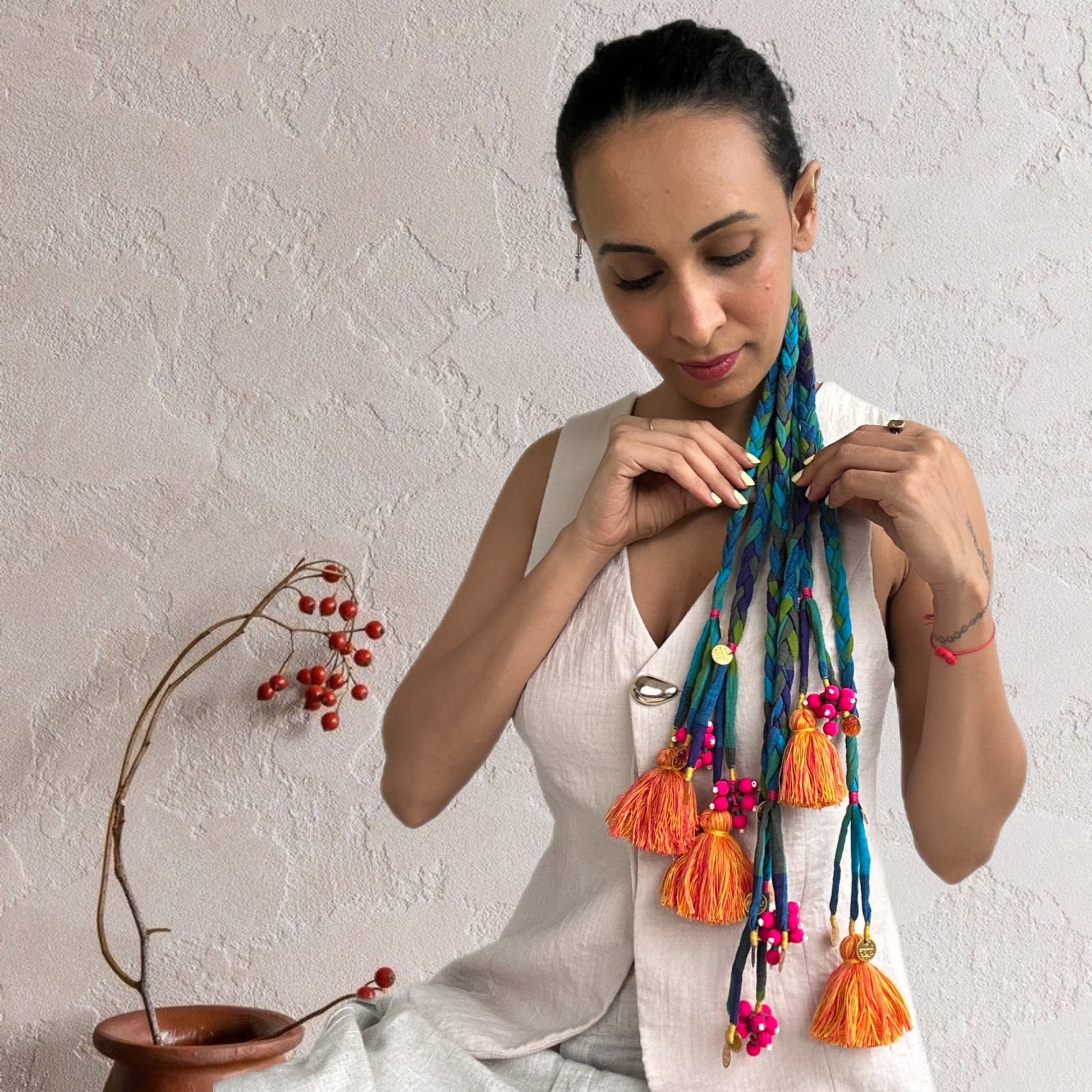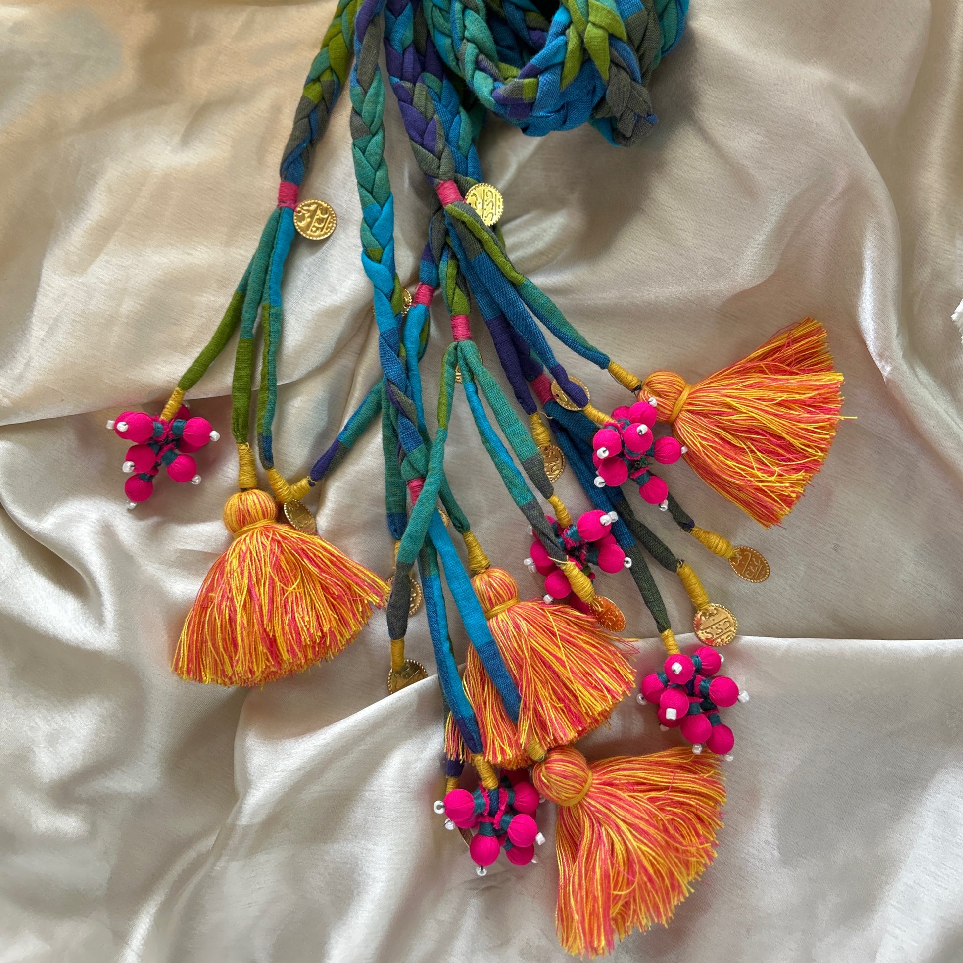 Cotton braided strings adorned with handmade fuller tassles & textile beads.