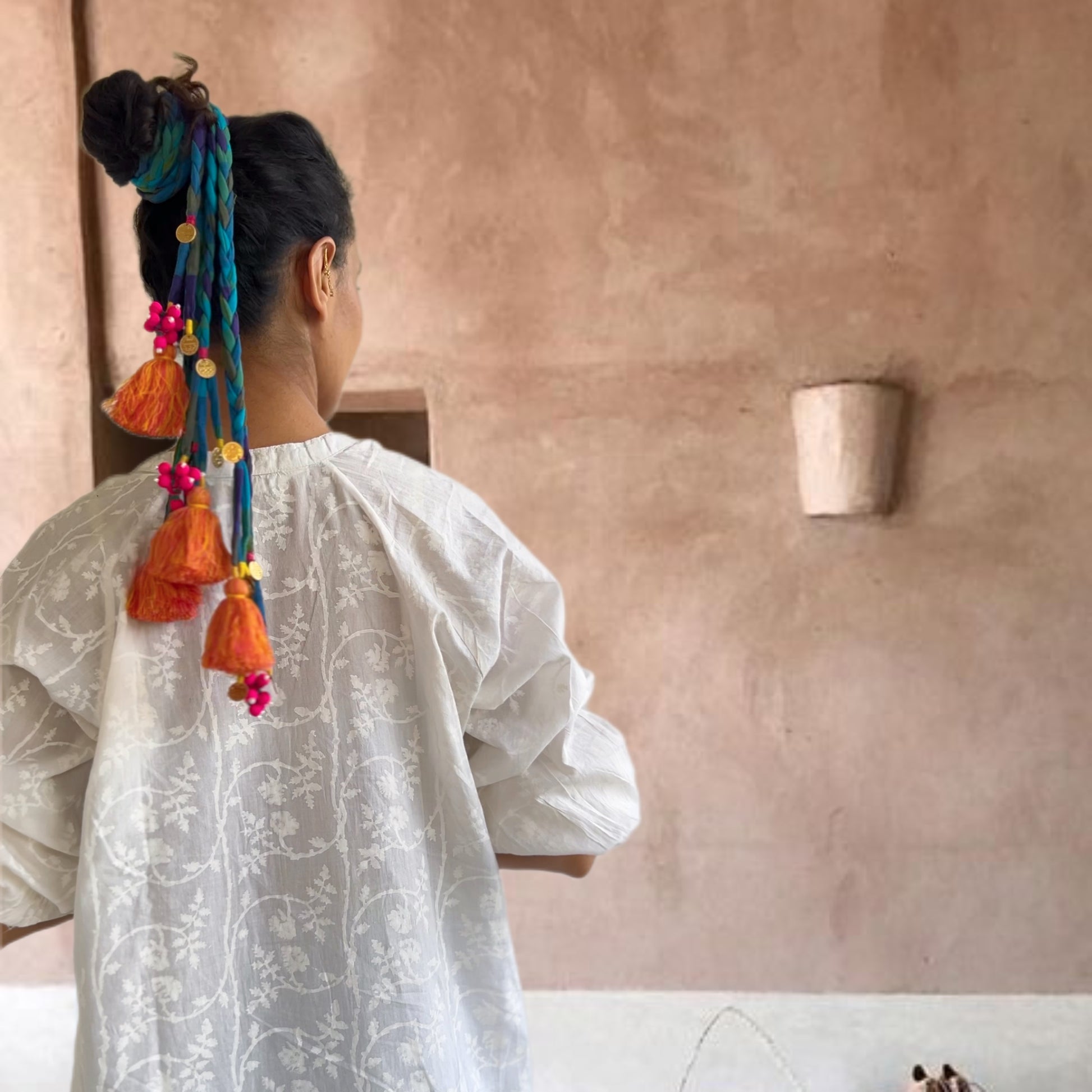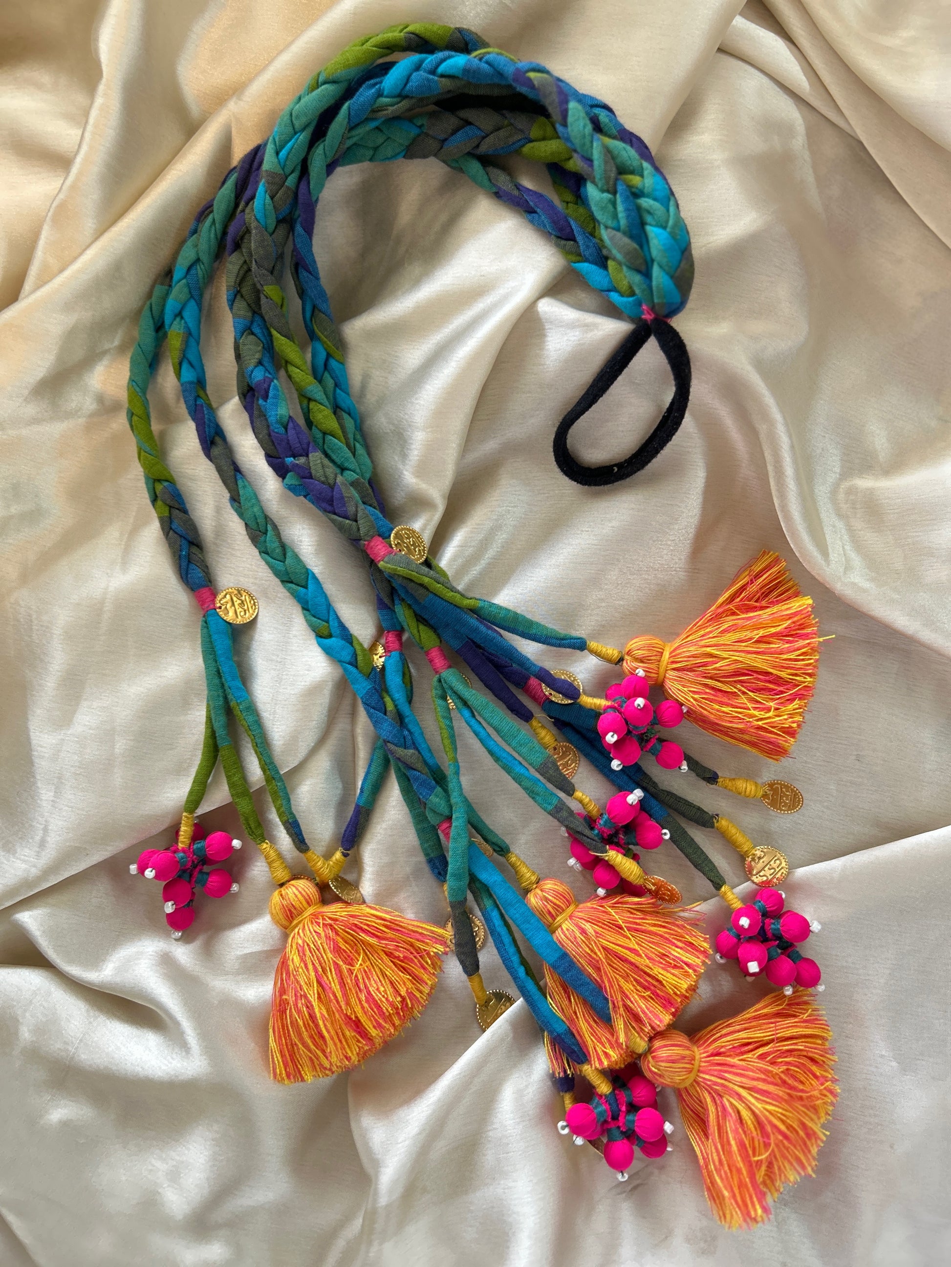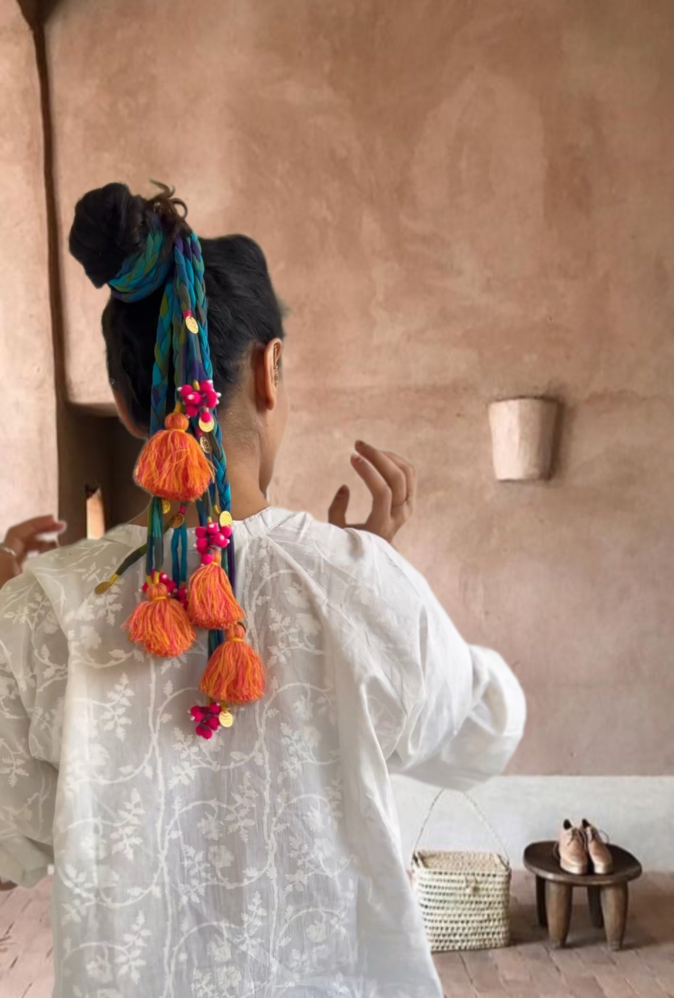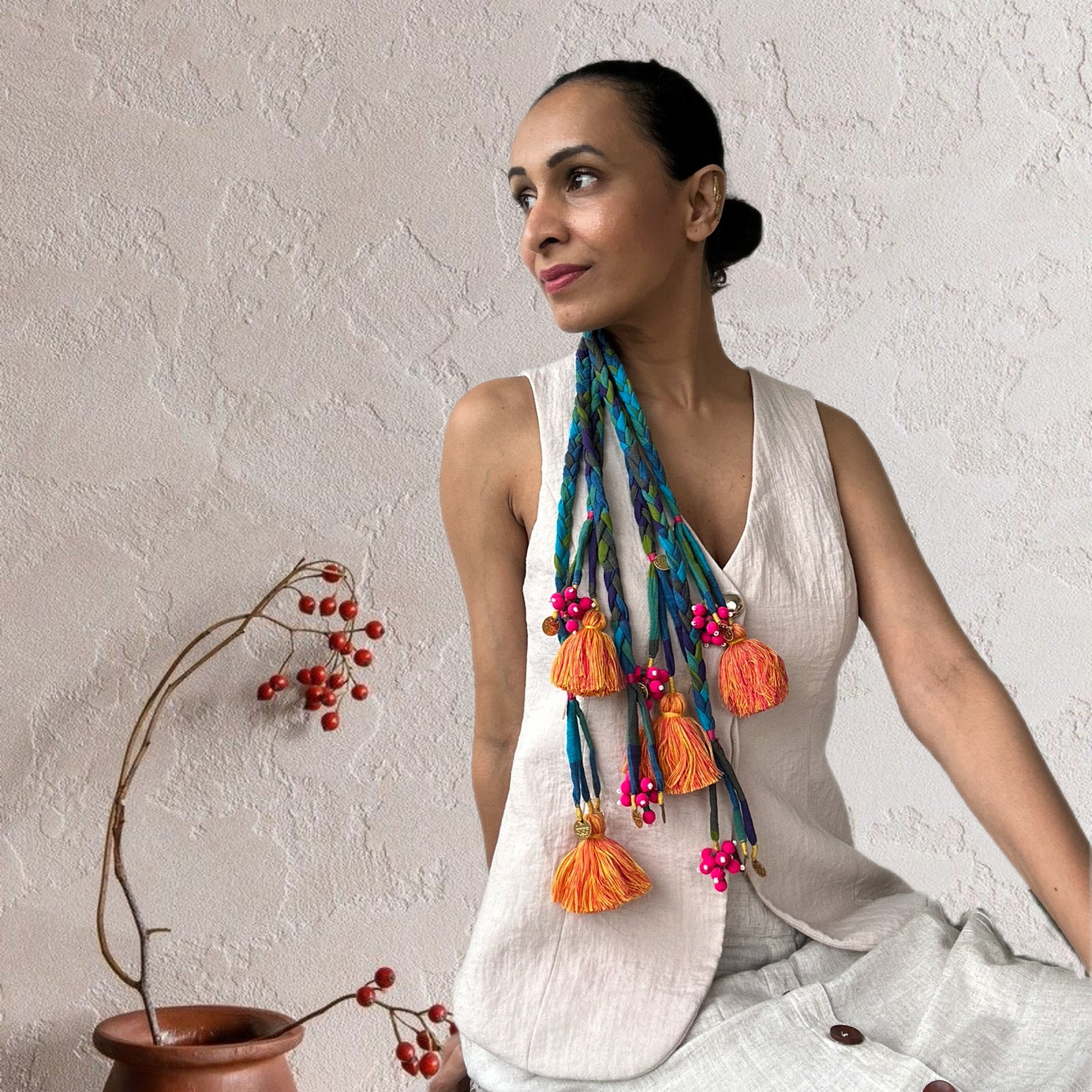 Cotton braided strings adorned with handmade fuller tassles & textile beads.