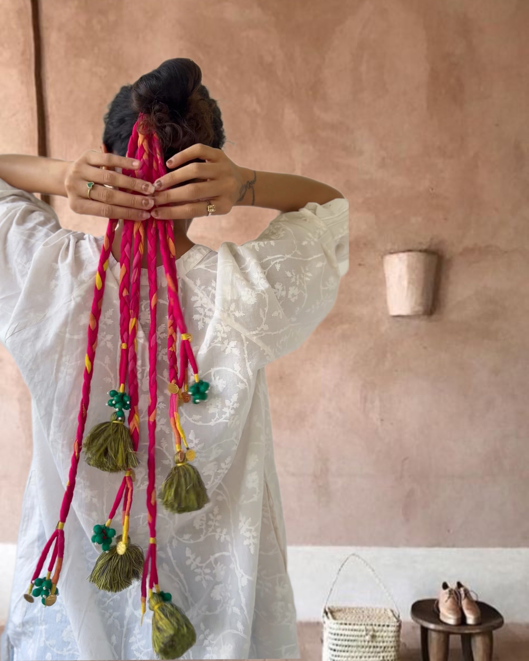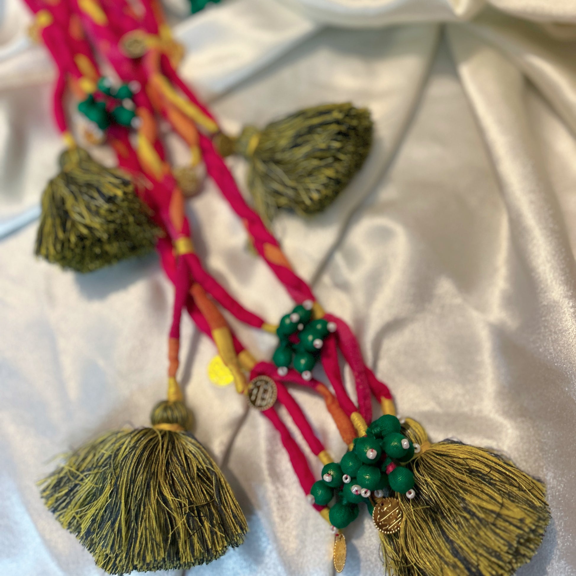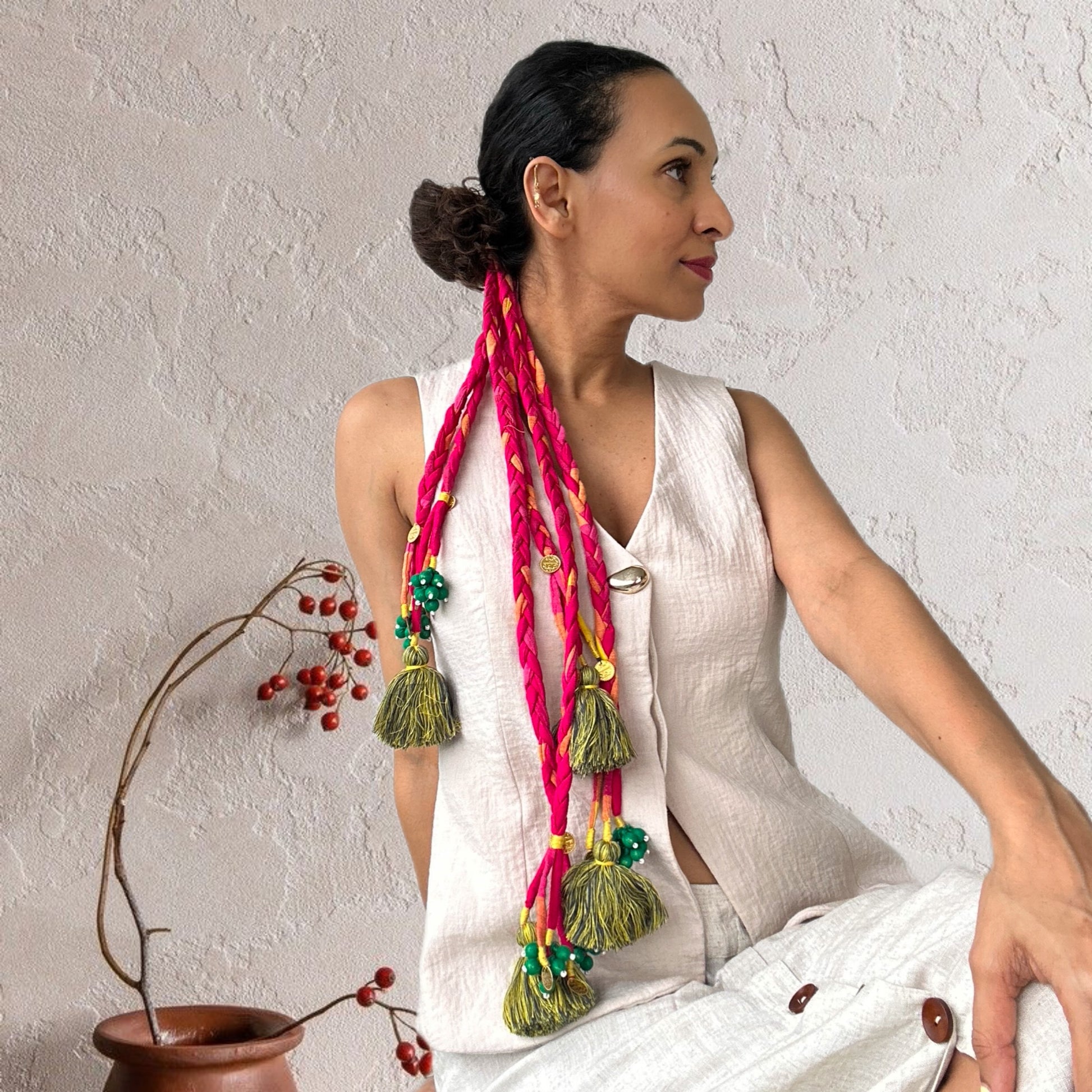 Cotton braided strings adorned with handmade fuller tassles & textile beads.