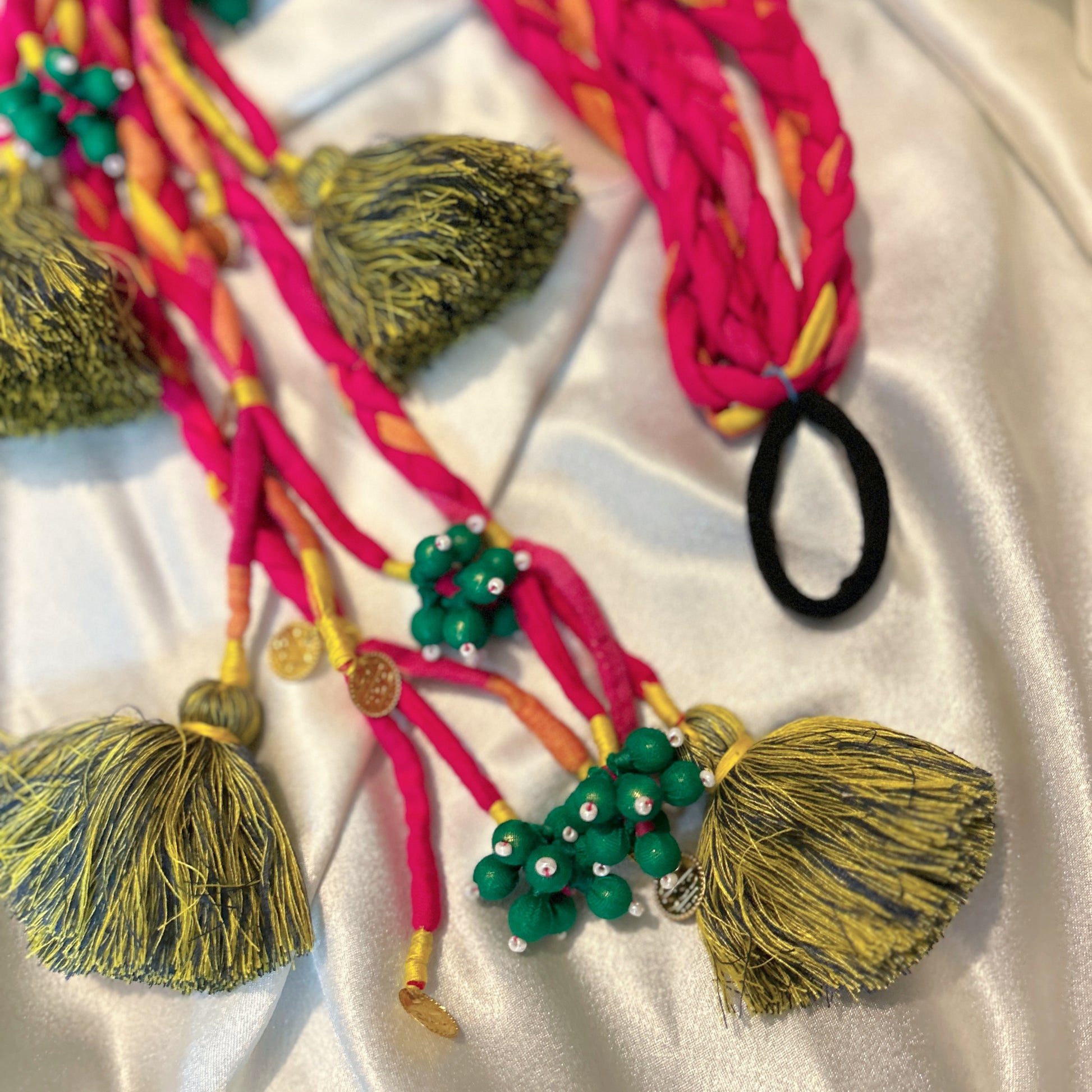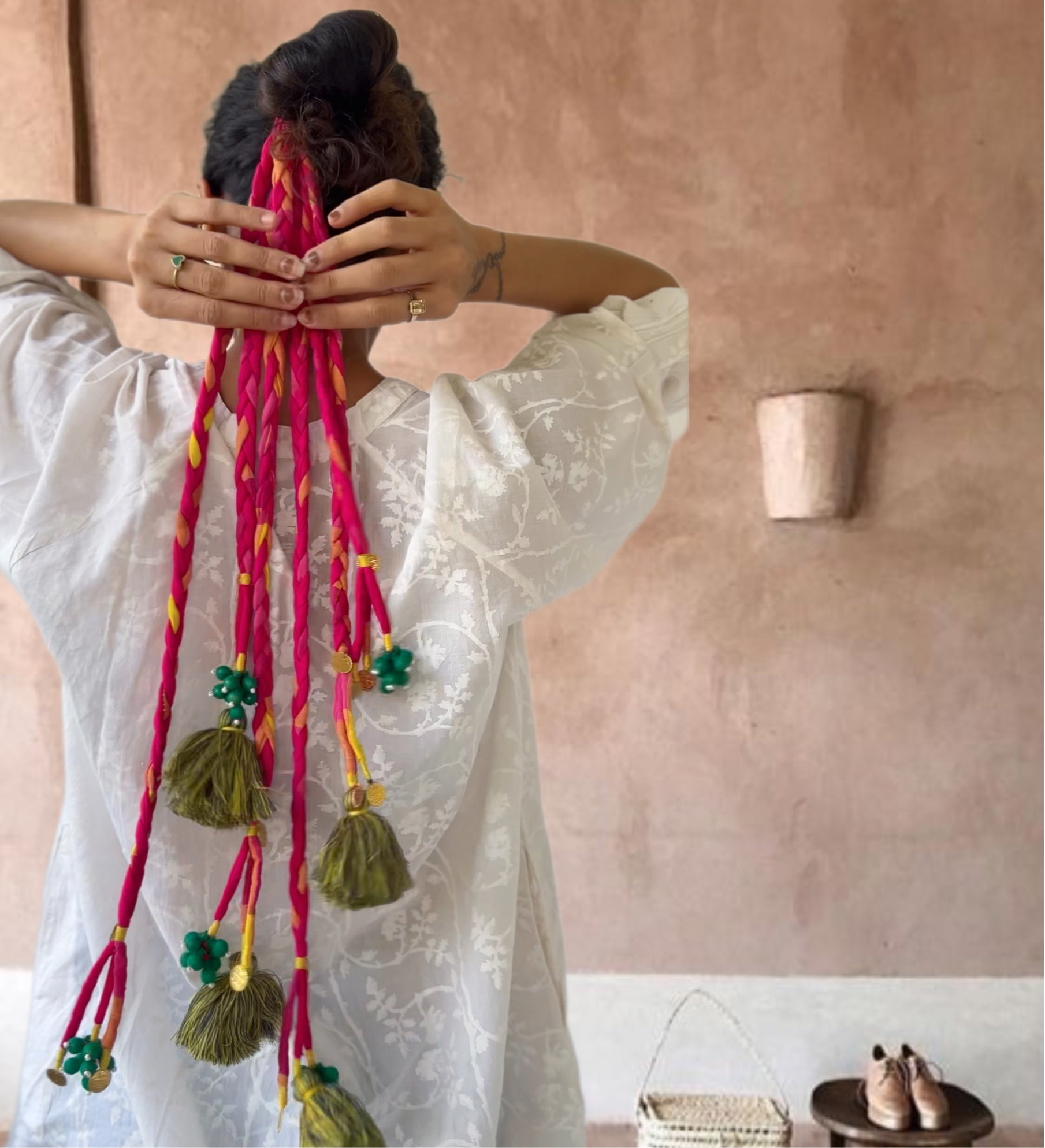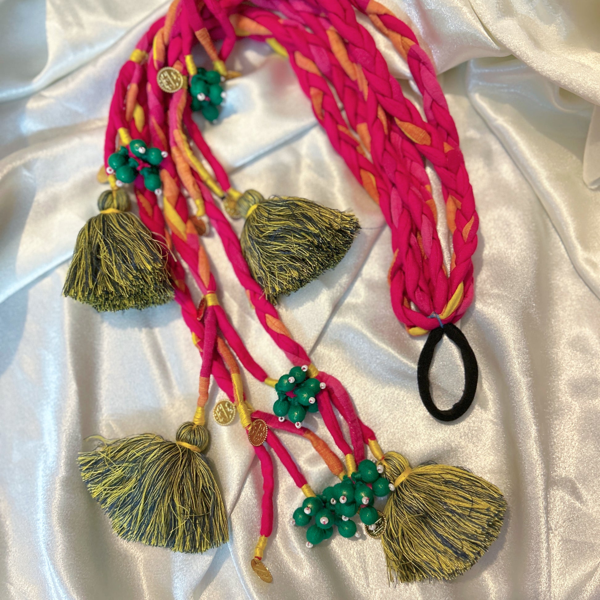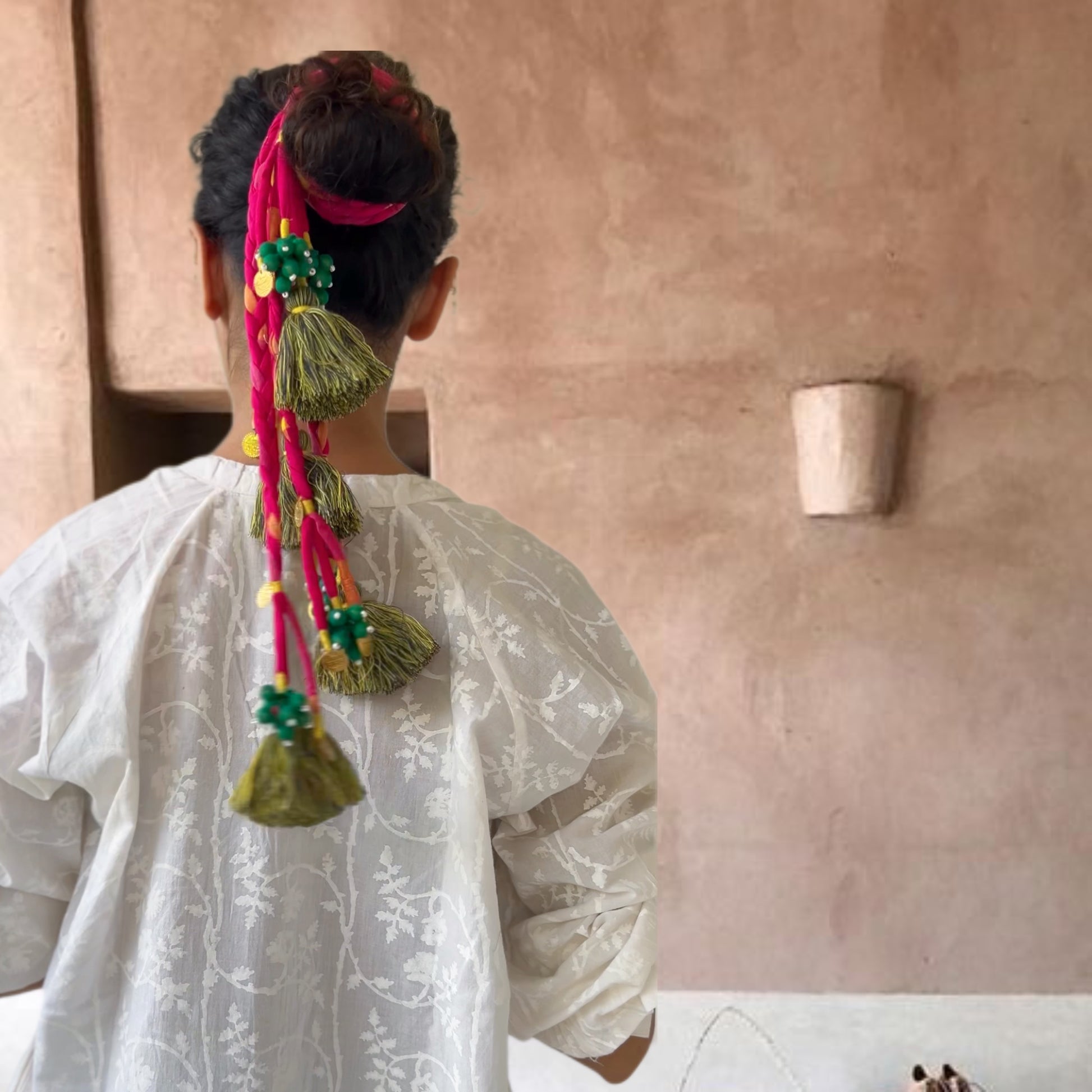 Cotton braided strings adorned with handmade fuller tassles & textile beads.