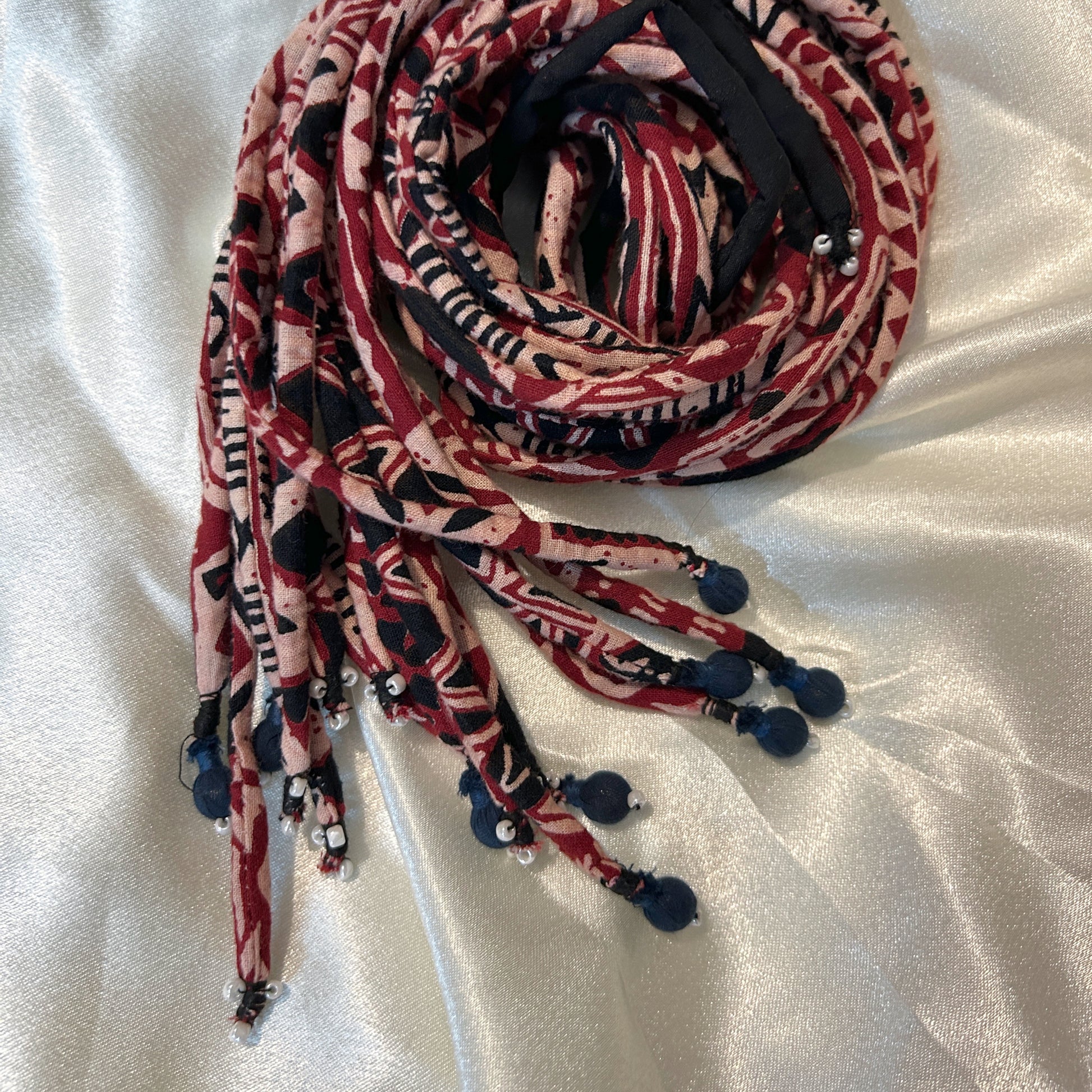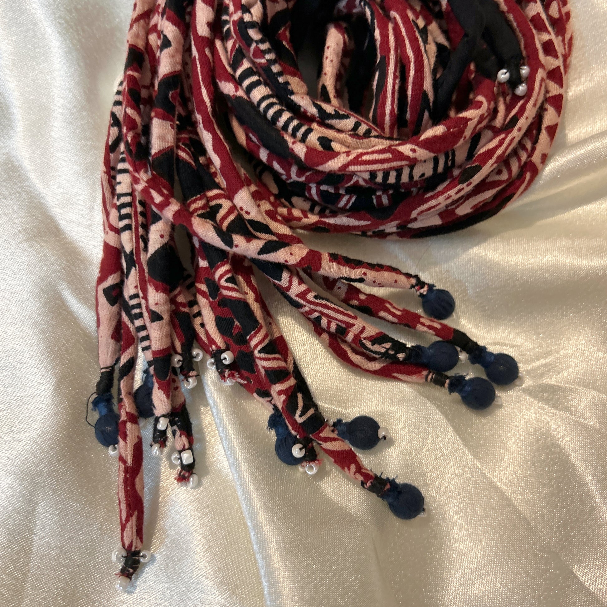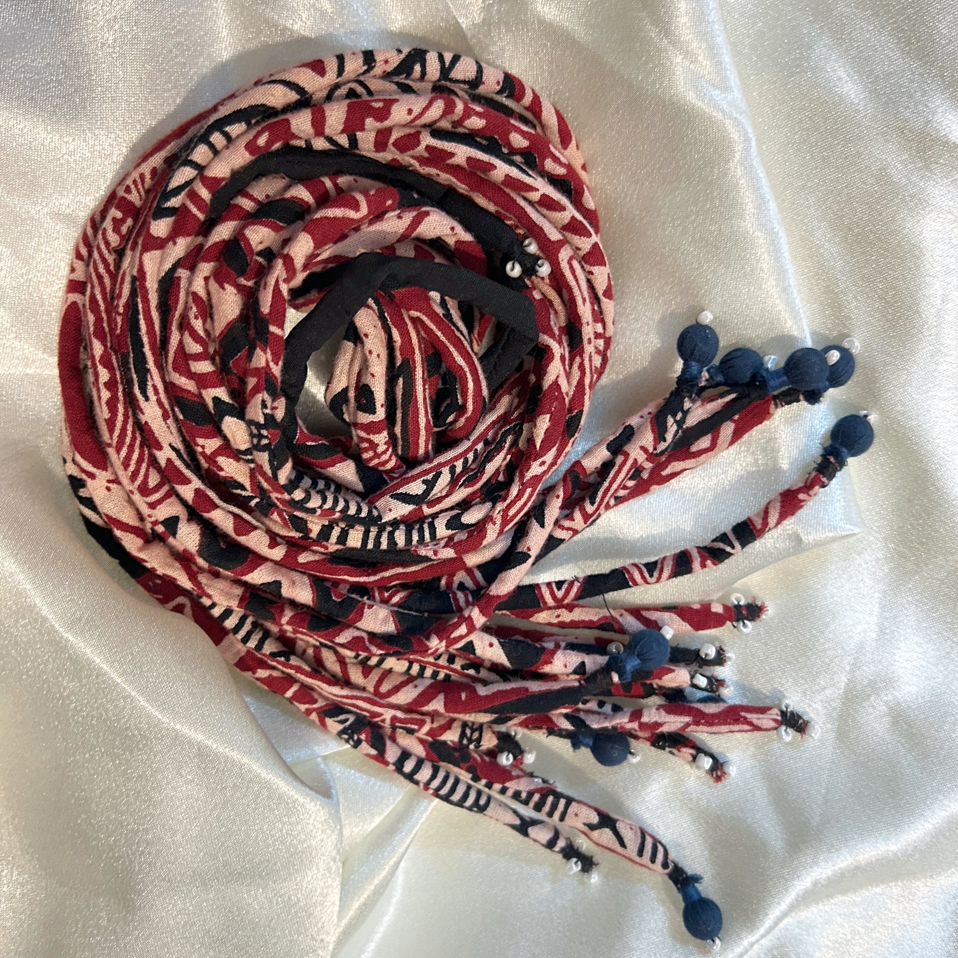 21 inch long hair strings with intricate glass bead work & textile beads at the end of each strand. This bunch comes with 9 strands divided into half.