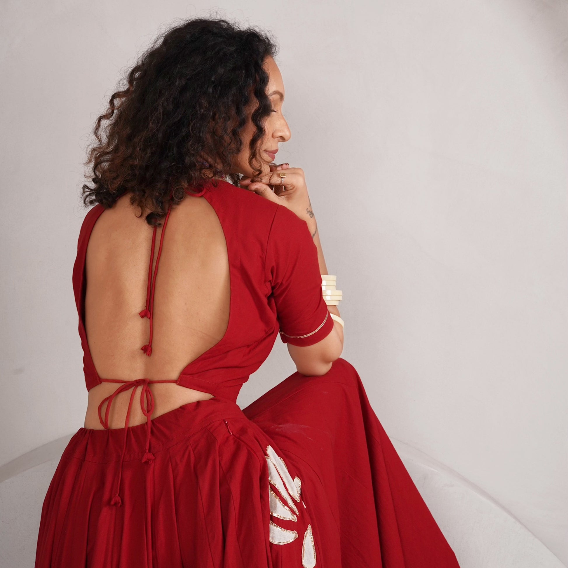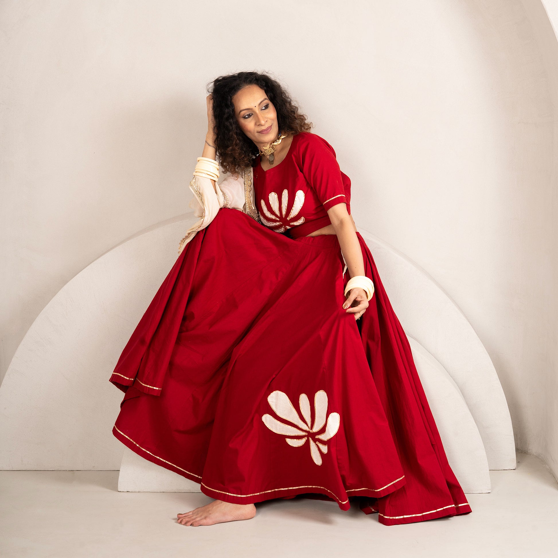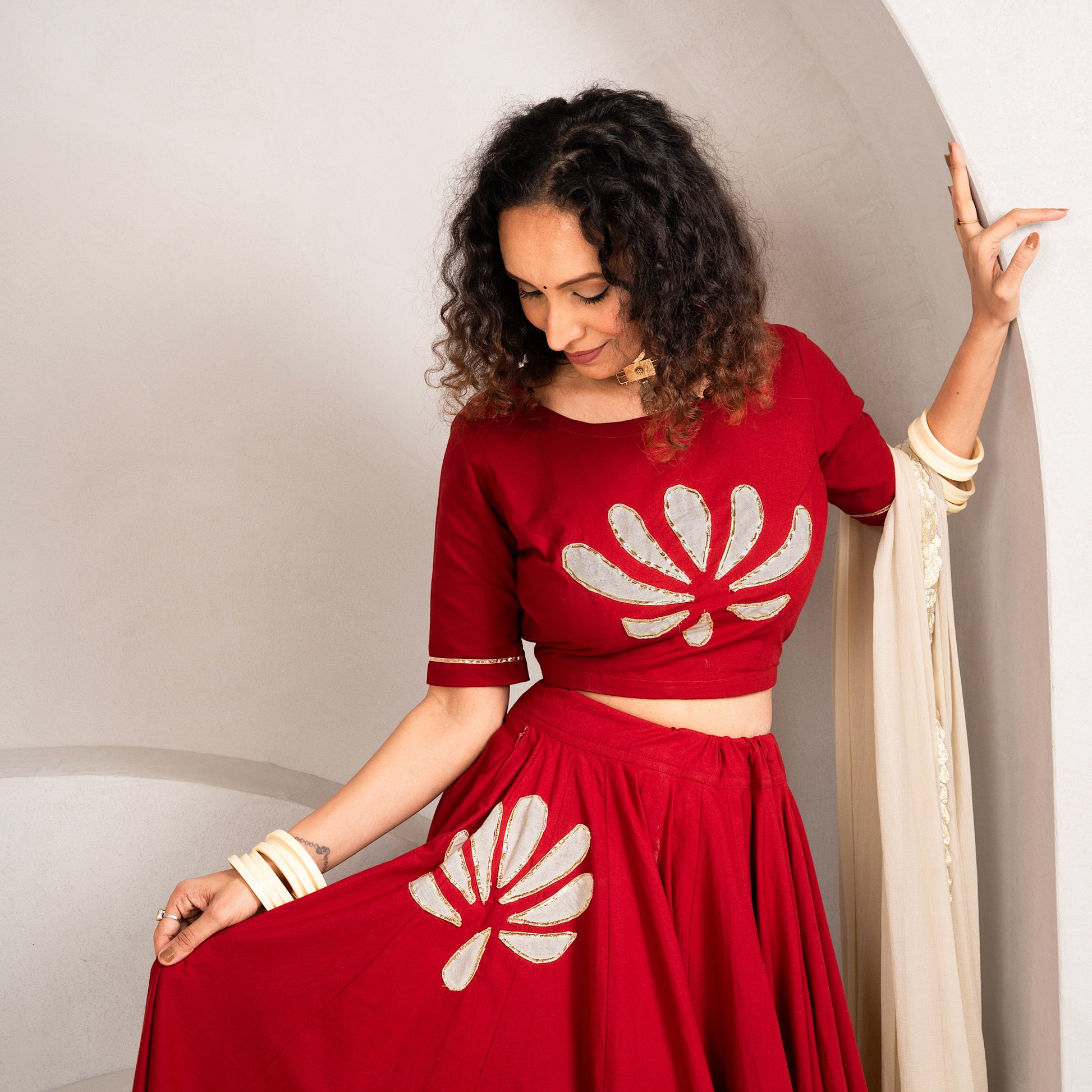 Deep maroon chaniya choli with flower motif, echoing the designs you love in our jewelry.