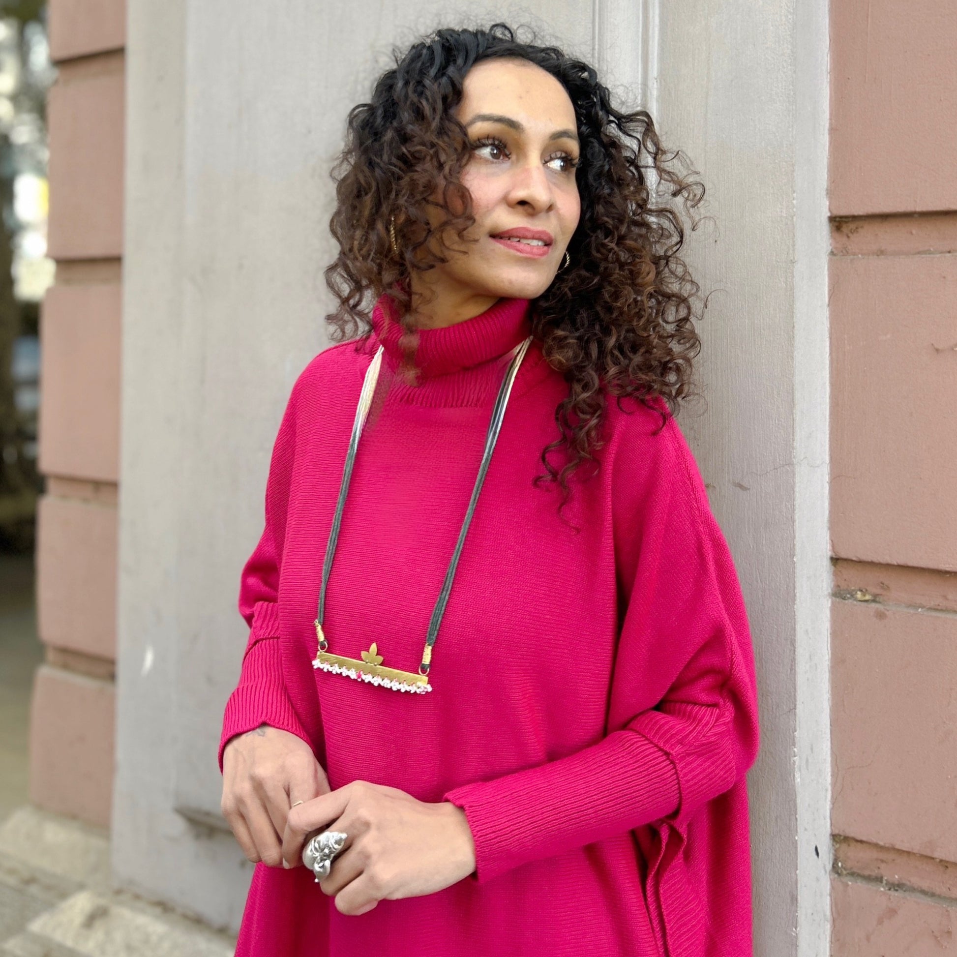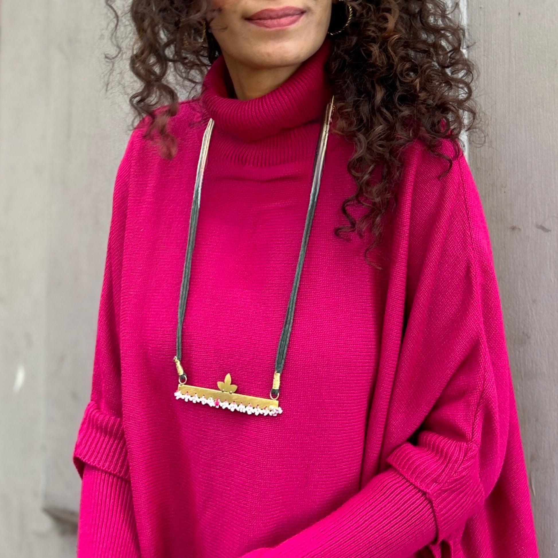 A sleek brass patti necklace with lotus motif and glass beads work. Comes with hand dyed adjustable dori.