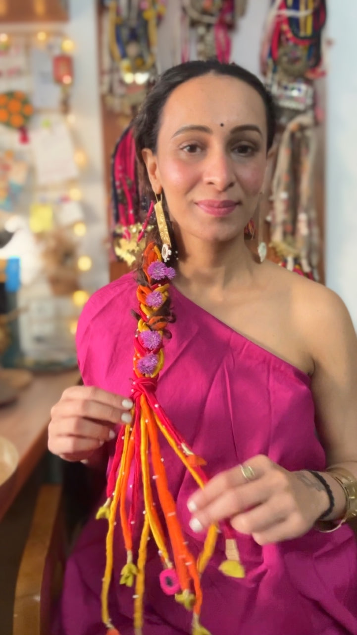 21 inch long silk hair strings with intricate glass bead work on each strand & brass charms at the end of each strand wrapped with kasab thread. This bunch comes with 6 strands divided into half.