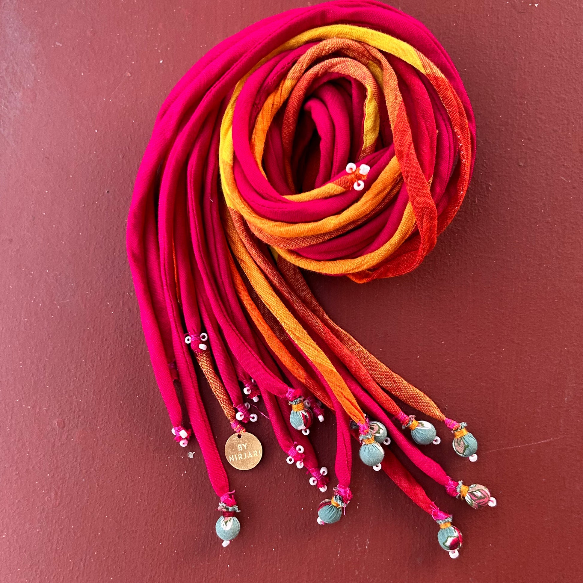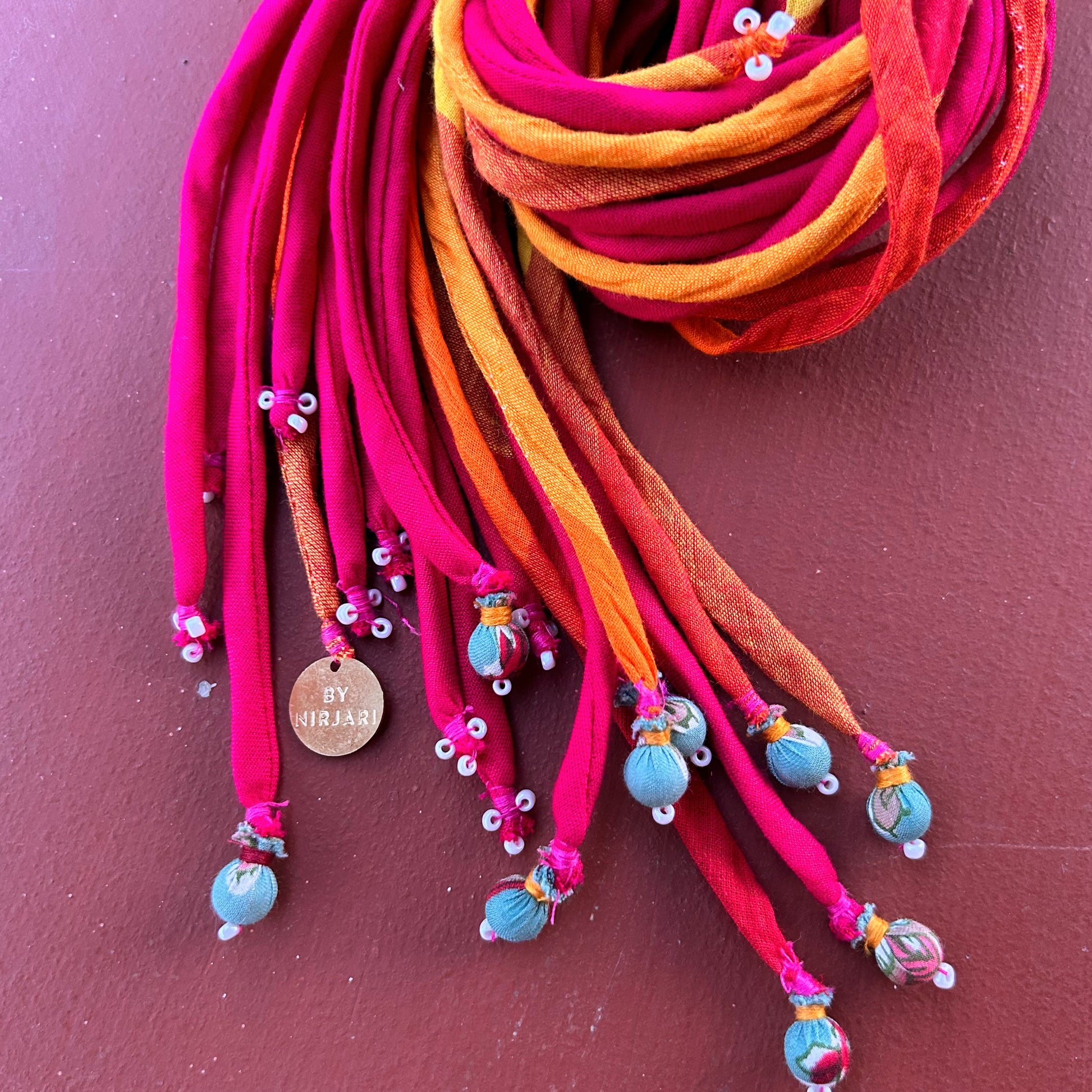 21 inch long hair strings with intricate glass bead work & textile beads at the end of each strand. This bunch comes with 9 strands divided into half.