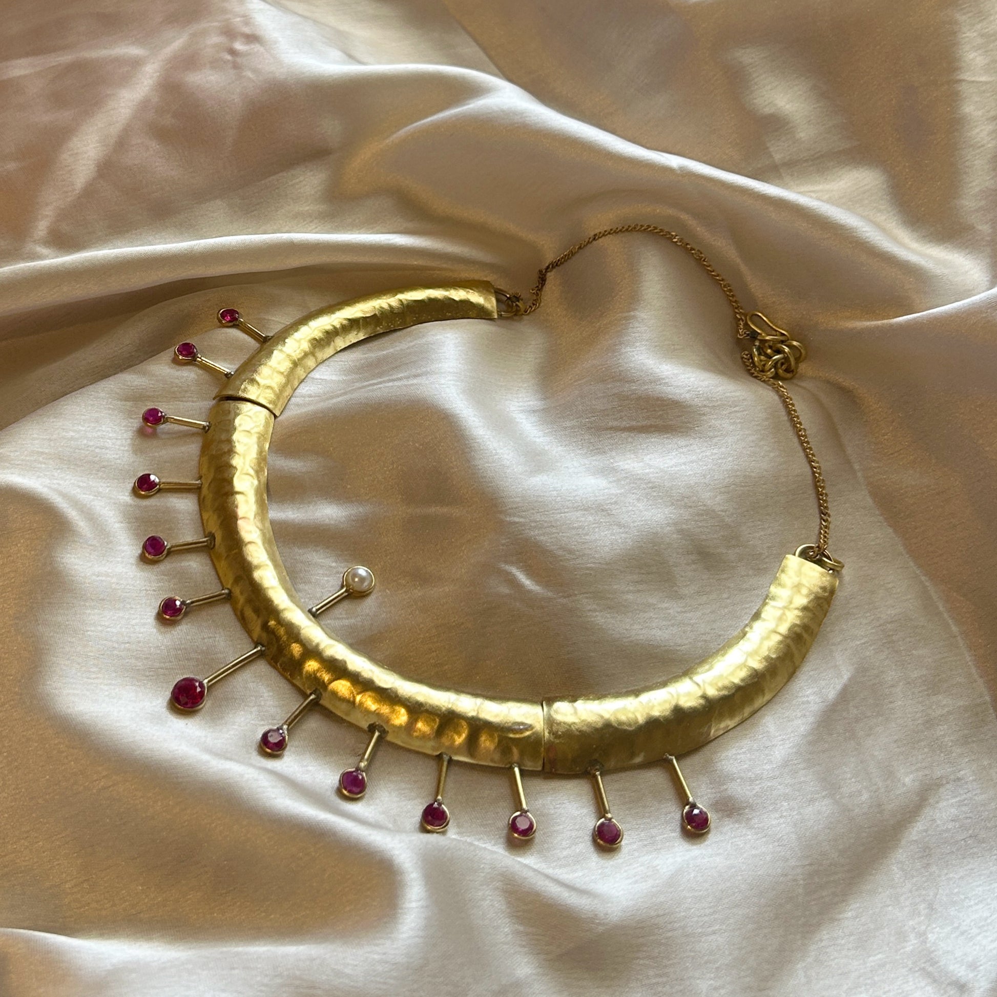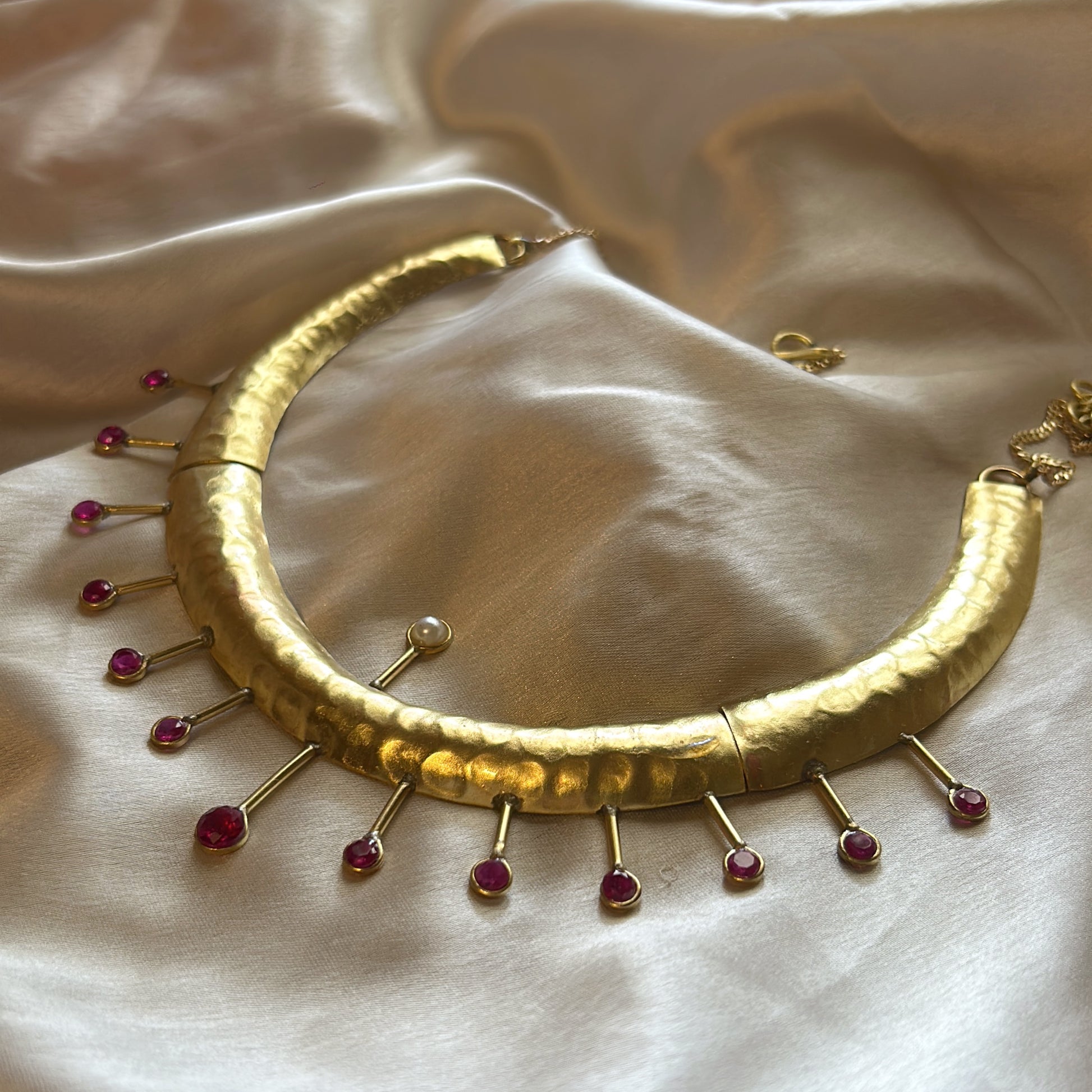 A hand hammered short length necklace with intricate pink CZ stone work.