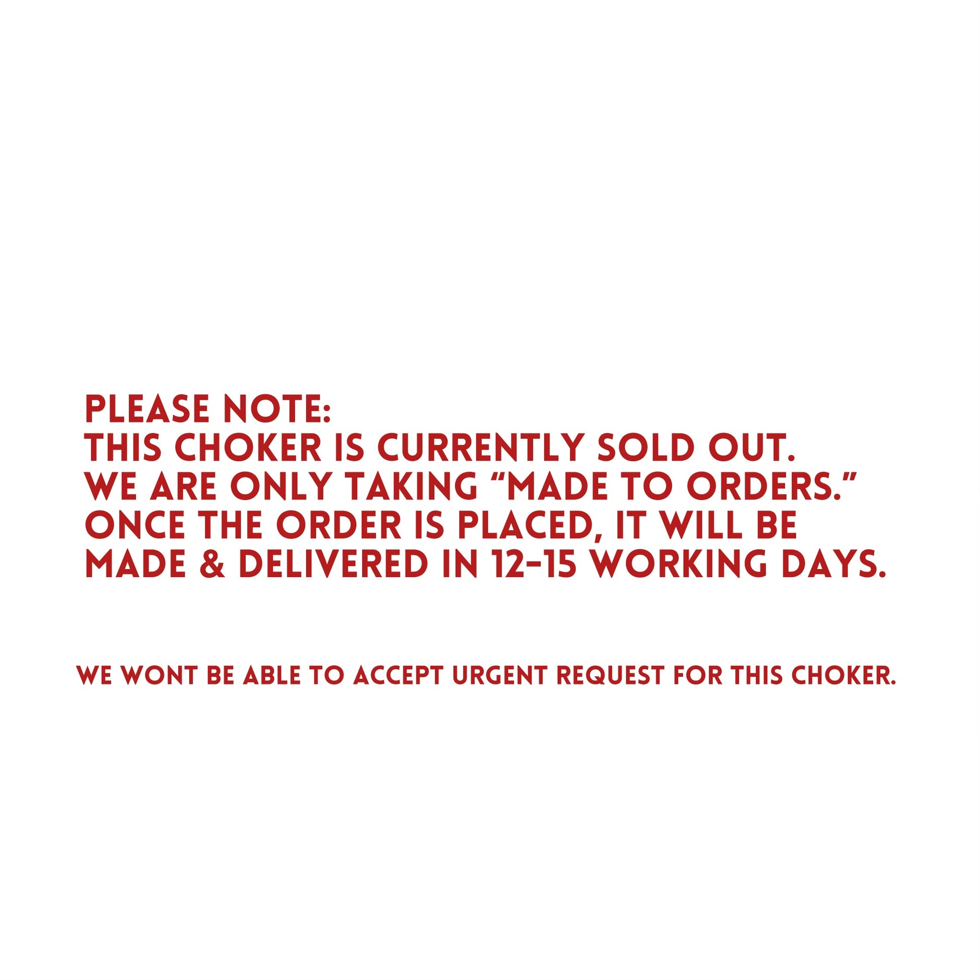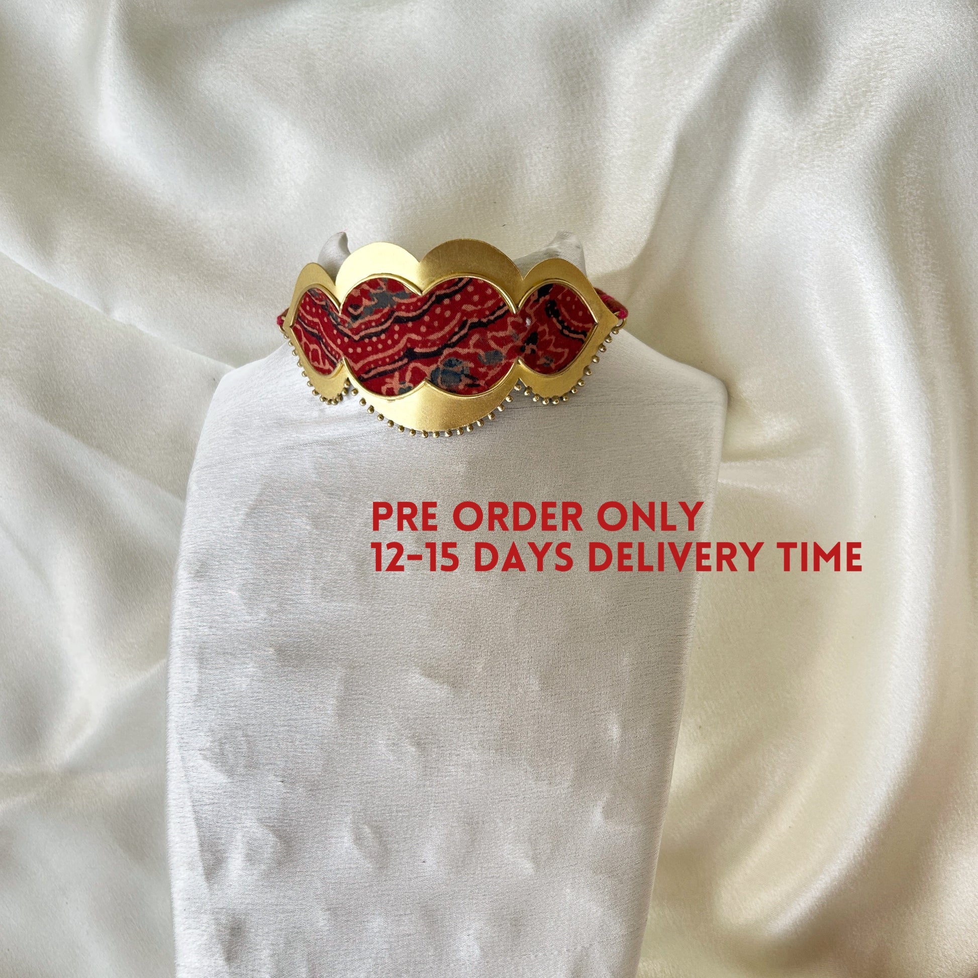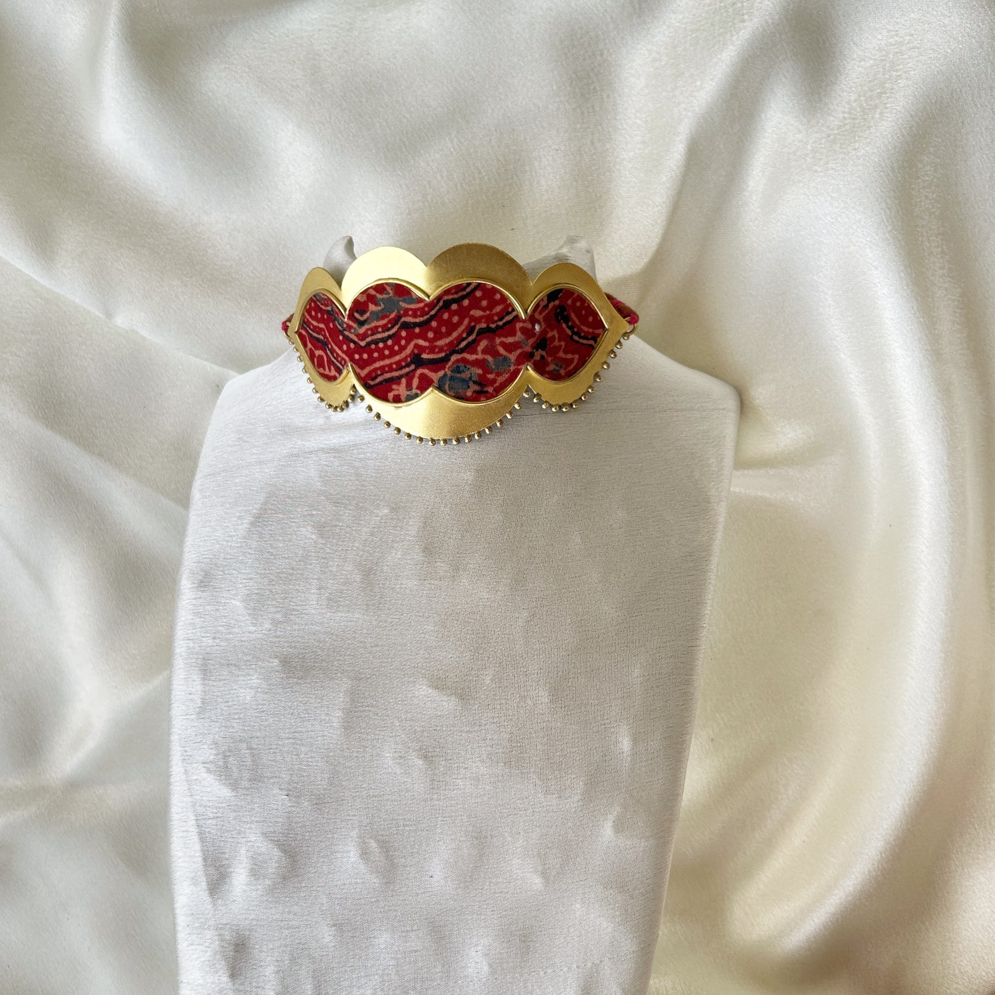 A beautifully shaped brass choker with ajrakh fabric framed on the base.