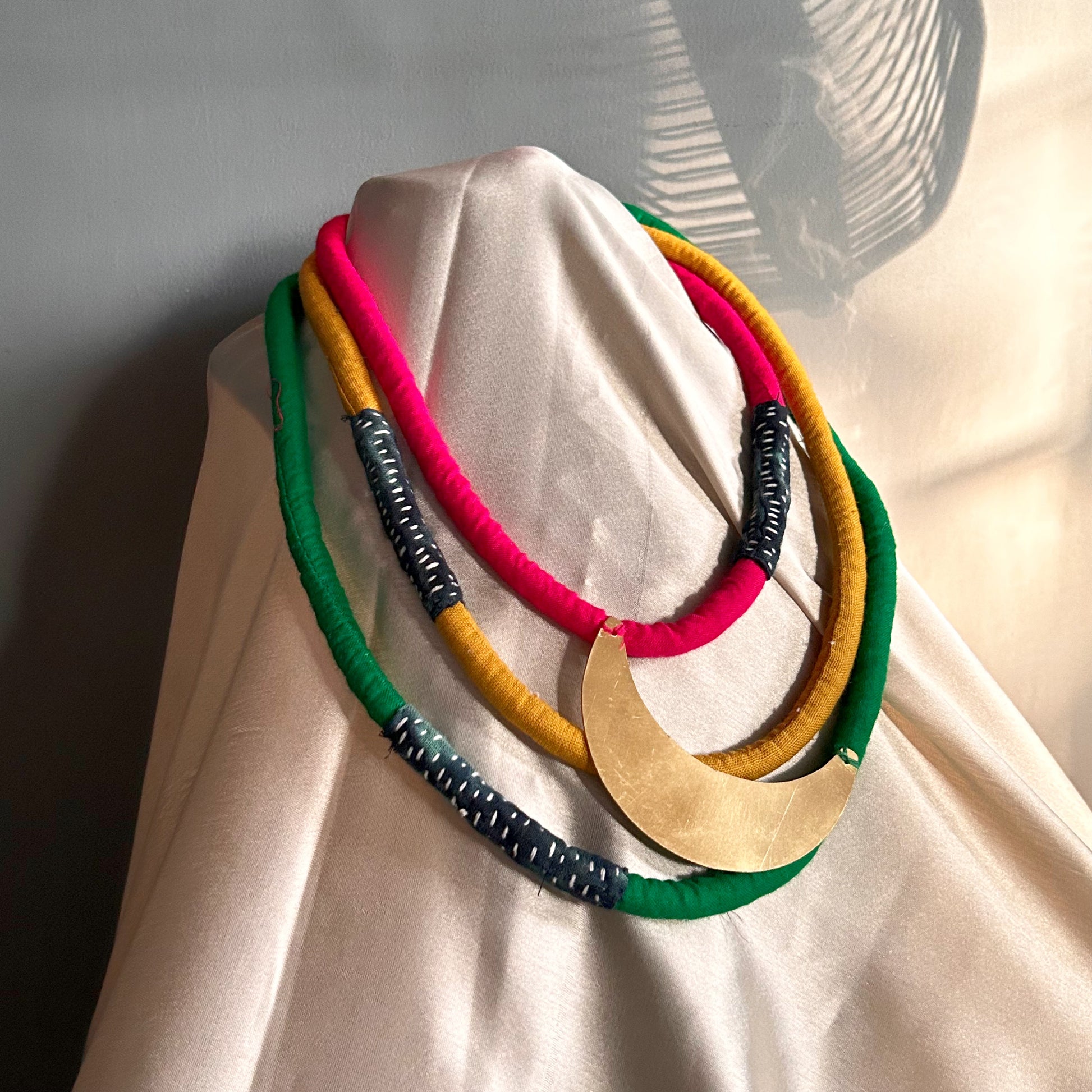 Three layered textile necklace with hand hammered brass in moon shape. This is adjustable necklace.